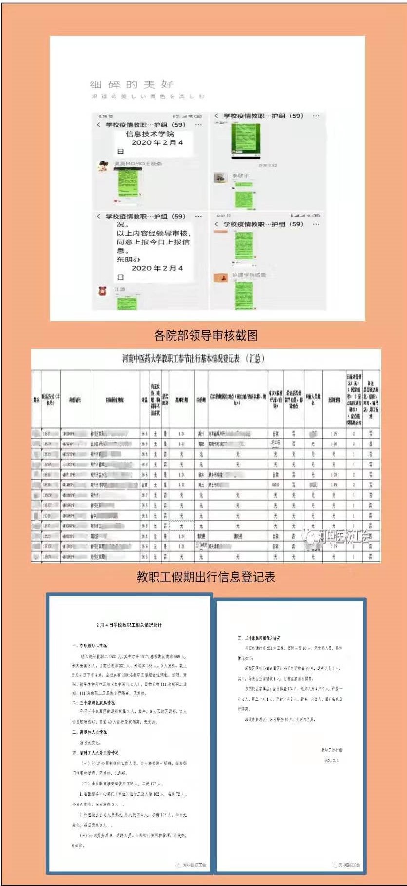 在学校新冠肺炎防控领导小组领导下,教职工防护组建立了全校47个院部(部门)联络员微信群,启动排查《亚盈app(中国)官方网站教职工春节出行情况登记》行动,全覆盖统计教职工假期离郑、返郑时间,教职工及家属有无接触武汉、信阳、南阳、驻马店、周口五地和发热情况等。实行每日一报制度,要求联络员每天给教职工群发信息、宣传防控知识、传达上级要求。同时,要求各院部(部门)领导审核上报信息,截图发送至微信群,确保全面准确掌握教职工的防控信息及身体状况。