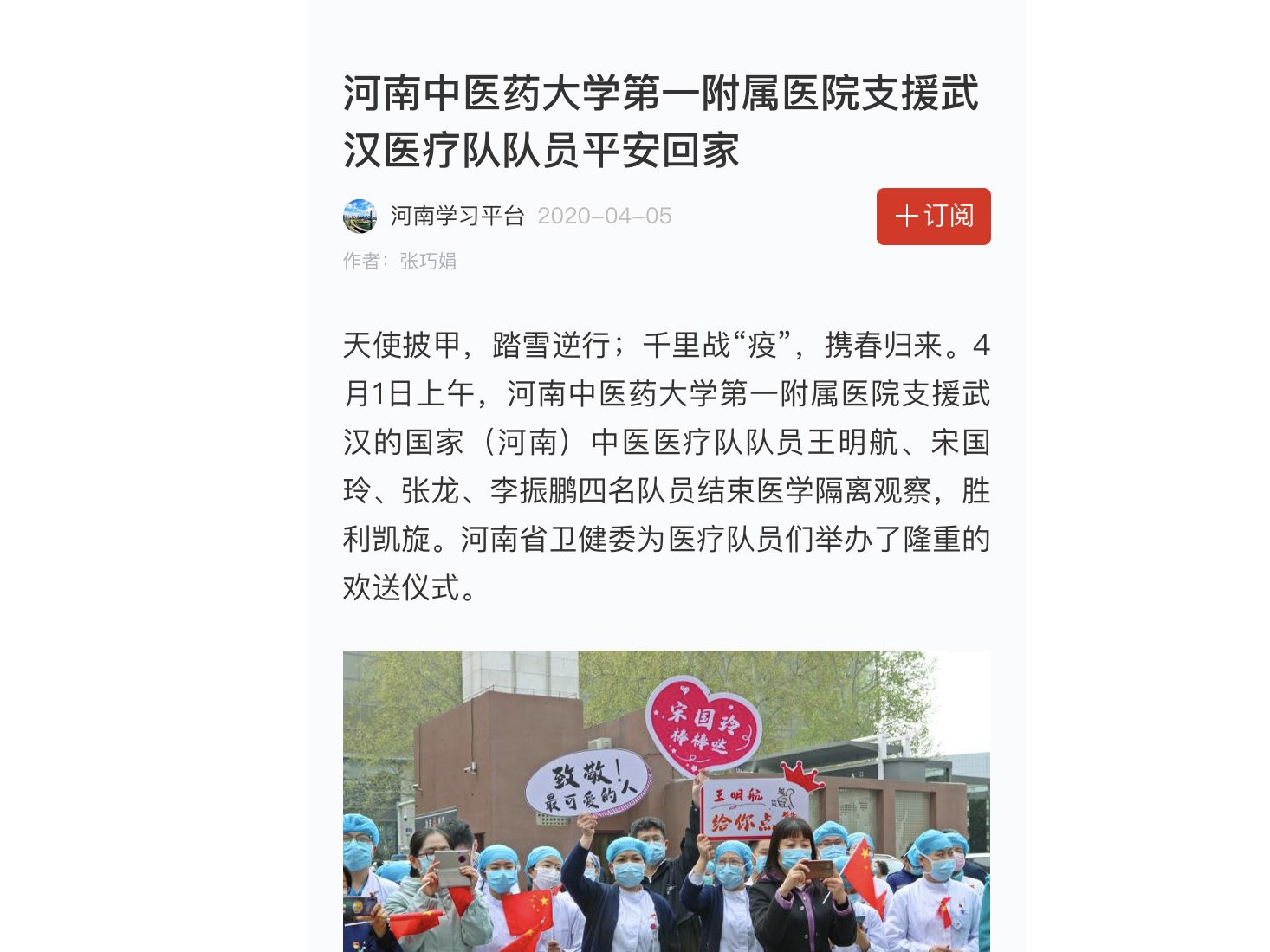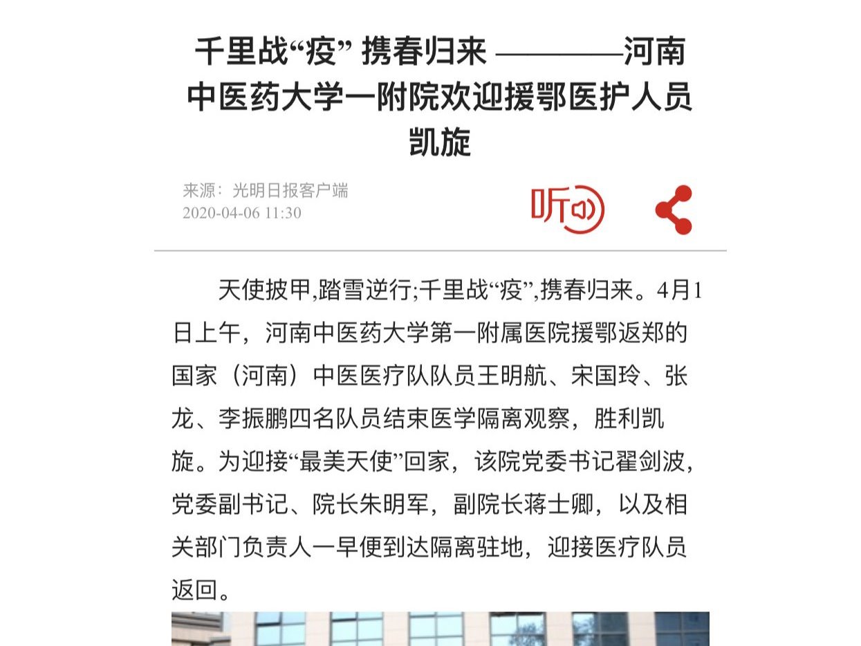 编者按:2020年4月5日-6日,学习强国、光明日报对我校一附院援鄂医疗队凯旋归来进行报道。现将光明日报客户端全文刊发如下: