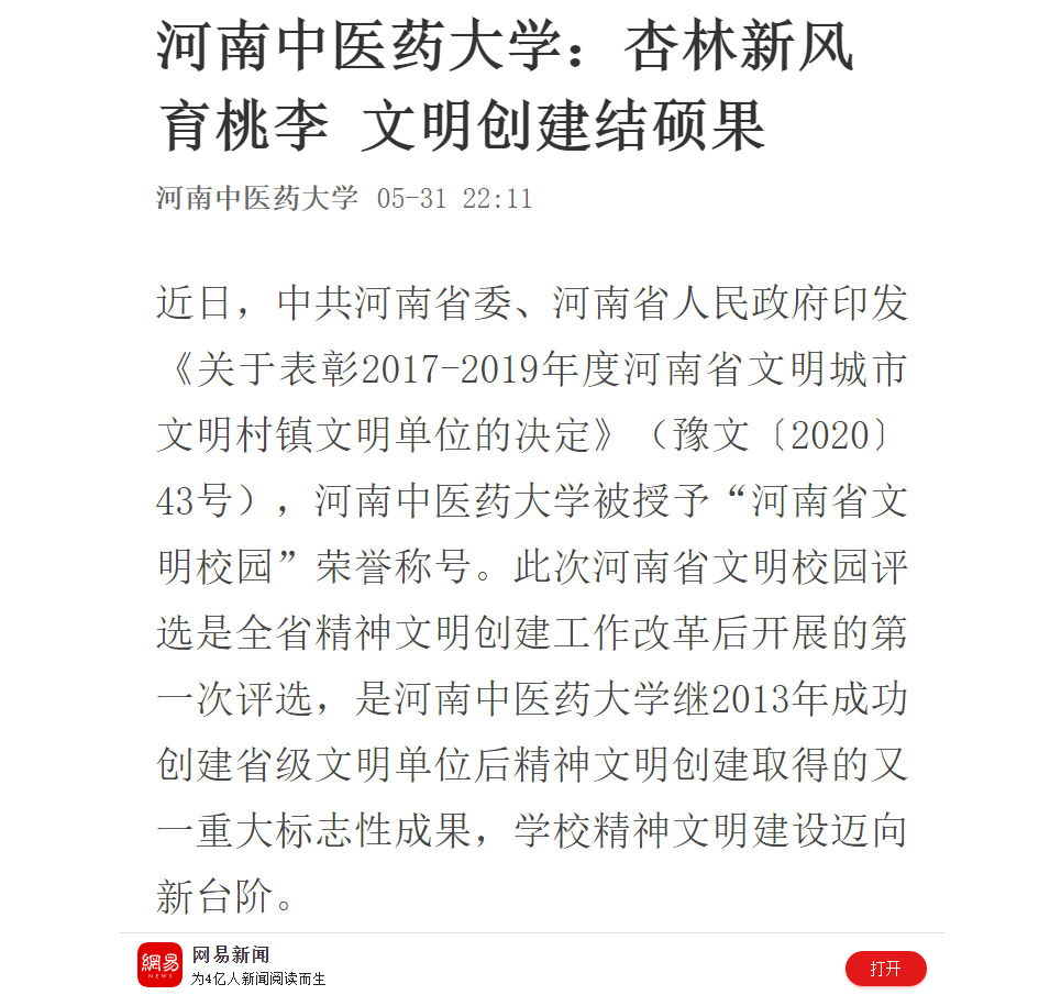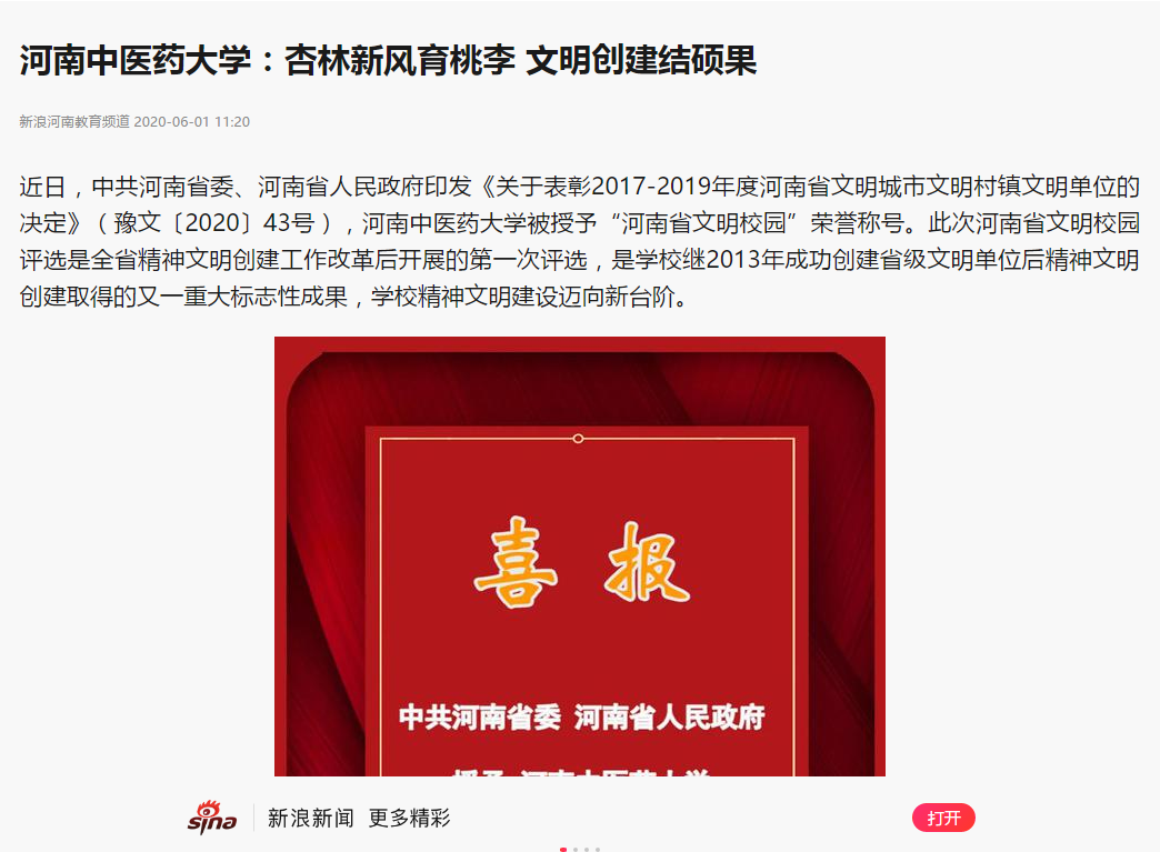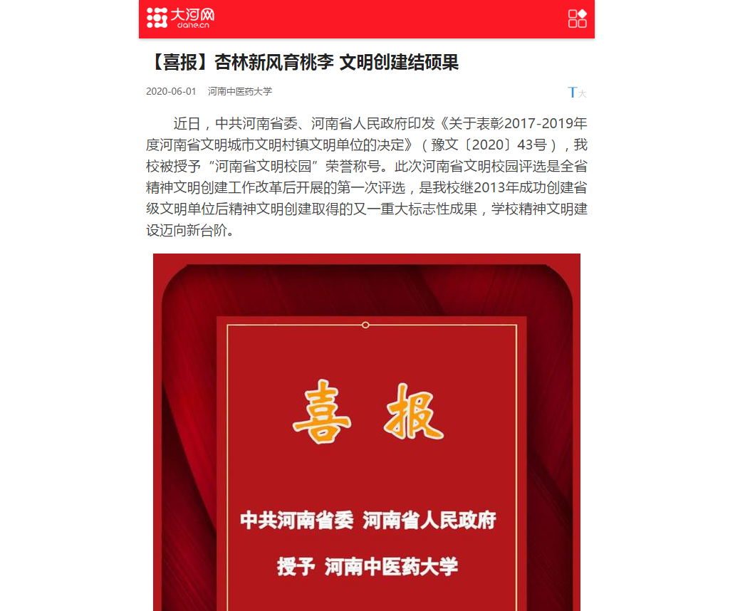 2020年5月31日-6月1日,大河网、网易新闻、新浪新闻对我校荣获“河南省文明校园”荣誉称号进行报道。