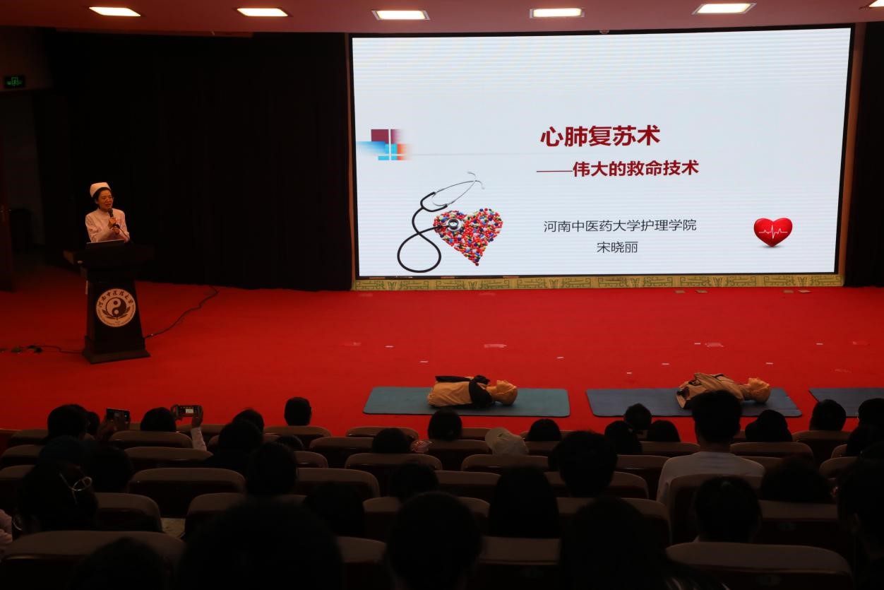 此次培训包含理论知识讲授、急救技术操作与互动、现场展示三个部分。护理学院教师王莉莉老师以《日常急救技术》为题,讲解了止血方案、骨折固定措施、海姆立克急救法等日常急救方法;教师宋晓丽以《心肺复苏术——伟大的救命技术》为题,讲授了心肺复苏术在急救中的重要性、实际操作方法和注意事项。在现场互动环节,同学们踊跃参与急救技术操作练习,在专业老师的指导下进行心肺复苏训练。在现场展示环节中,全国医学技术技能大赛护理学专业华中、华南区一等奖获得者现场展示了院前急救、团队复苏两个案例,从专业的角度进行现场急救模拟演练,她们娴熟的动作和默契的配合赢得了现场观众热烈的掌声。