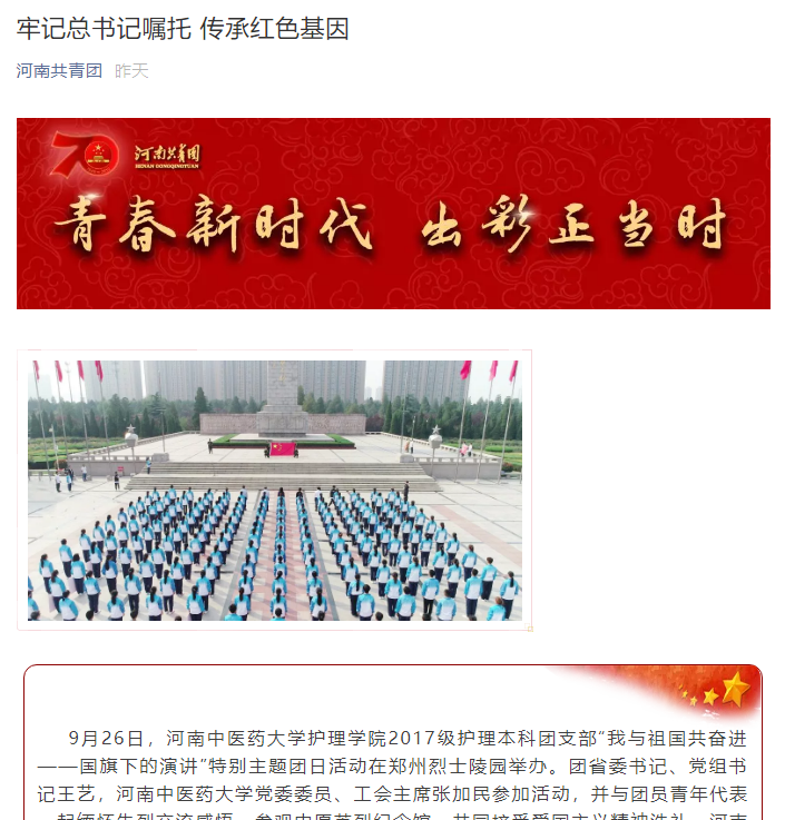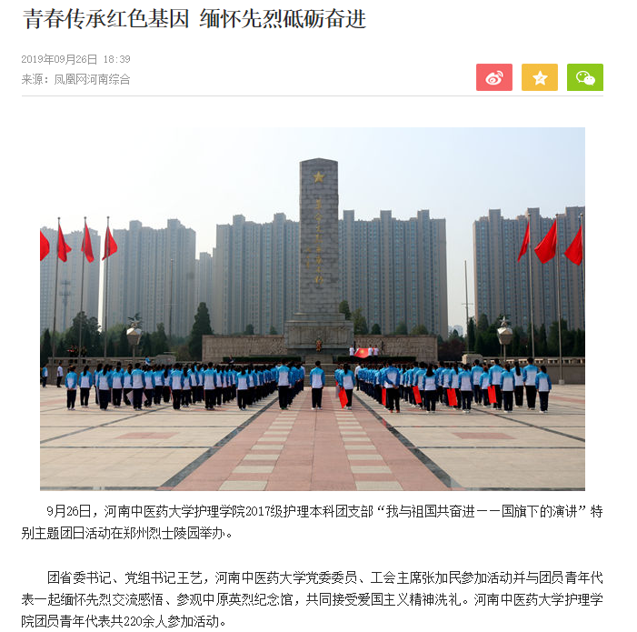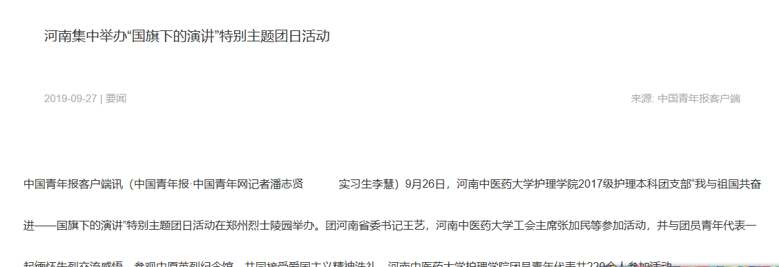 编者按:2019年9月27日,中国青年报客户端、凤凰网、河南共青团官方微信等媒体对我校2017级护理本科团支部开展的“我与祖国共奋进——国旗下的演讲”特别主题团日活动进行了报道。