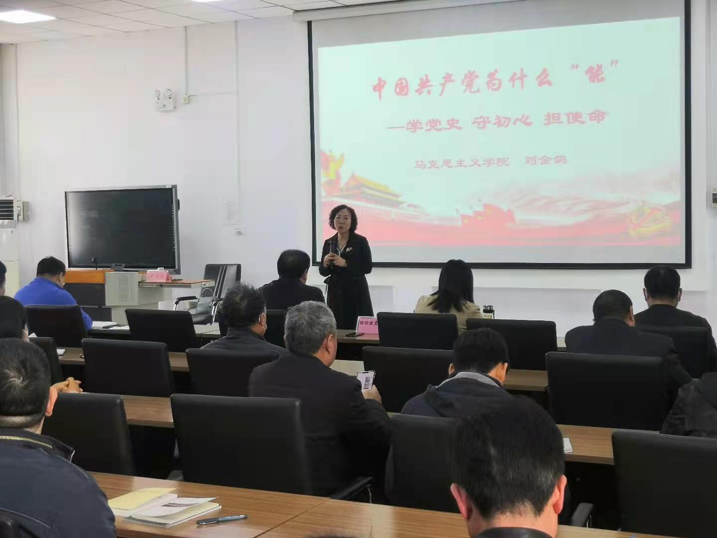 本网讯(图文/王景辉)2021年4月6日下午,亚盈app(中国)官方网站马克思主义学院马克思主义中国化研究党支部书记刘金鸽教授在老校区图书馆4楼会议室,为继续教育学院、东明办、老干部处“学党史 守初心 担使命”培训班做《中国共产党为什么“能”》专题讲座。讲座由继续教育学院总支书记杨结实主持,来自三个部门的50多名党员、教师参加。