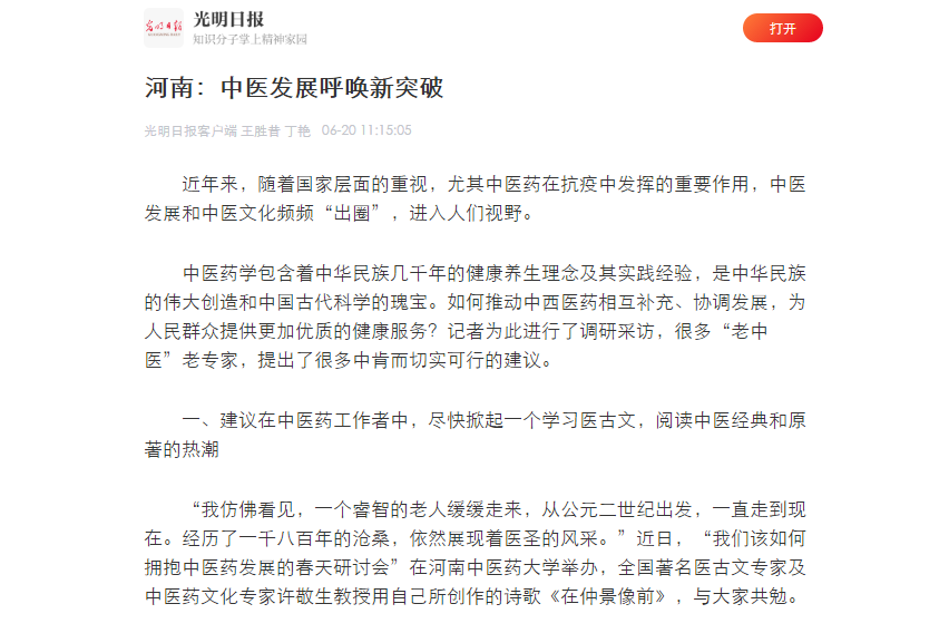 编者按:2021年6月20日,光明日报客户端对全国著名医古文专家及中医药文化专家、我校许敬生教授,校科研处处长李东阳,首届全国中医高校教学名师、我校赵文霞教授对中医发展的建议进行报道。现将文章刊发如下: