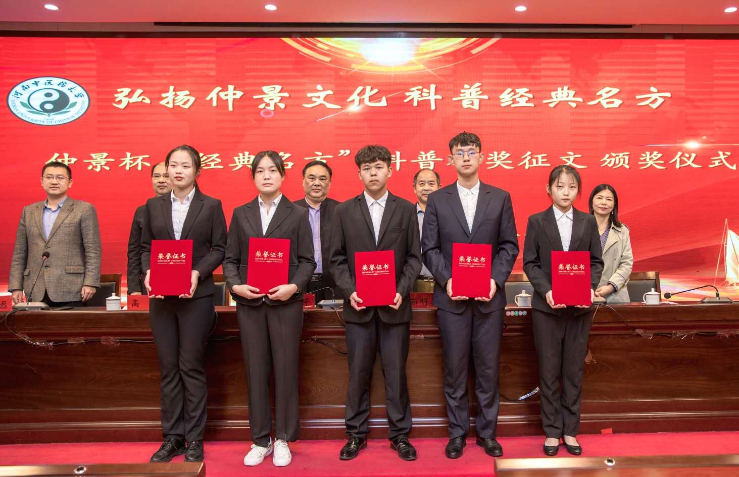 颁奖仪式上,宣读了《“仲景杯”经典名方科普征文大赛获奖名单》,仲景宛西制药有限公司和我校双方领导嘉宾共同为获奖学生代表颁奖。2019级中西医临床医学本科三班李庆庆作为获奖学生代表发言,与同学们分享了自己的经方学习方法及征文创作经历。高松在讲话中介绍了仲景宛西制药有限公司的经营理念,对母校的高度重视及积极组织表示衷心感谢,高度肯定了同学们在比赛中的精彩表现,并表达了对加强校企合作、弘扬传承中医药文化的殷切期望。他鼓励同学们要继续开拓创新,共同打造仲景品牌。赵小燕宣读了征文活动后续的有关通知。