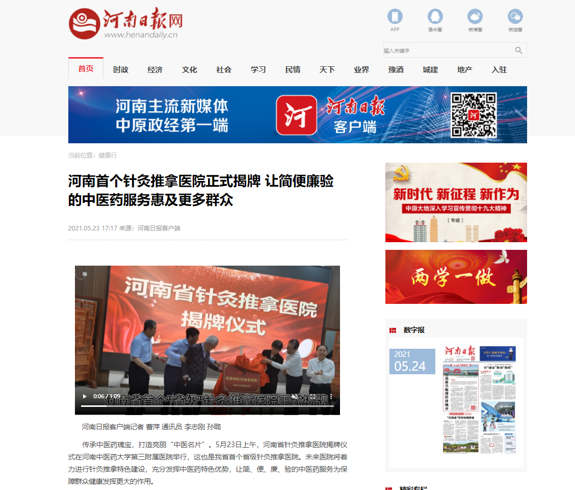 编者按:为传承中医药瑰宝,打造亮丽“中医名片”,2021年5月23日上午,河南省针灸推拿医院揭牌仪式在三附院举行。河南卫视、河南日报网、郑州日报、医药卫生报等多家媒体纷纷报道。