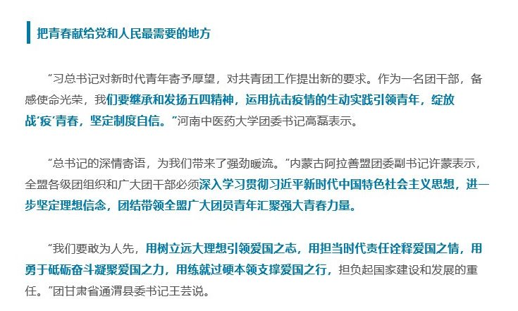 习近平总书记对新时代青年寄予厚望,对共青团工作提出新的要求。作为一名团干部,备感使命光荣,我们要继承和发扬五四精神,运用抗击疫情的生动实践引领青年,绽放战“疫”青春,坚定制度自信。