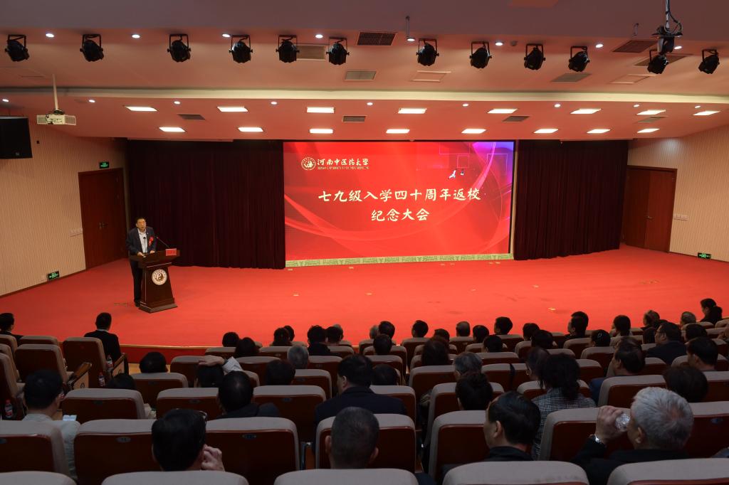 七九级校友入校四十周年纪念大会在图书馆第一报告厅举行。会议由苗明三主持。别荣海在致辞中欢迎校友们返校,并从人才培养、师资队伍、学科建设、科学研究、医疗服务等方面介绍了学校近年来的办学成就和未来的发展规划。他指出,七九级校友是奋斗的一代,为振兴发展中医药事业做出了突出贡献,真诚希望各位校友与母校携手共创更加辉煌的未来。