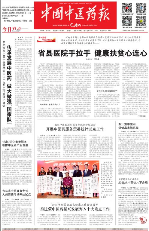 本网讯(文/韩序)2019年1月30日,《中国中医药报》在第5018期头版,以“省县医院手拉手 健康扶贫心连心”为题,报道了一附院帮扶睢县中医院、上蔡县中医院相关工作,对医院在健康扶贫中创新形式、真抓实干,大幅提升国家级贫困县整体医疗水平、实现多方共赢的成绩予以充分肯定。