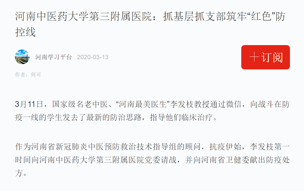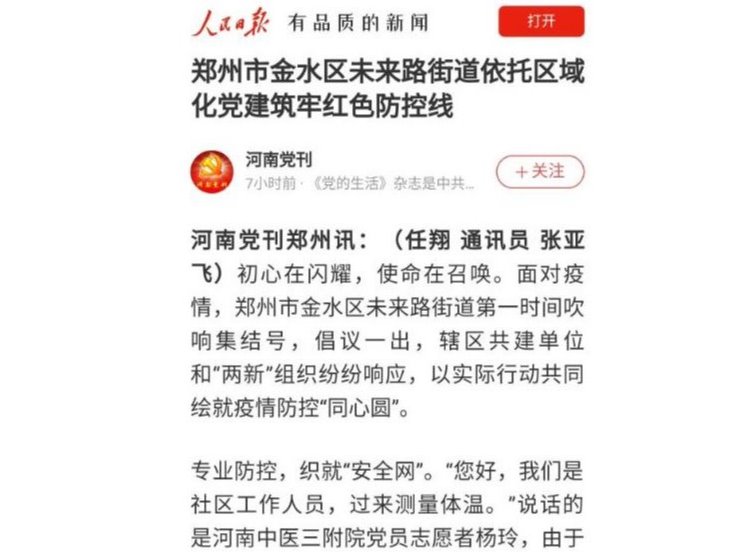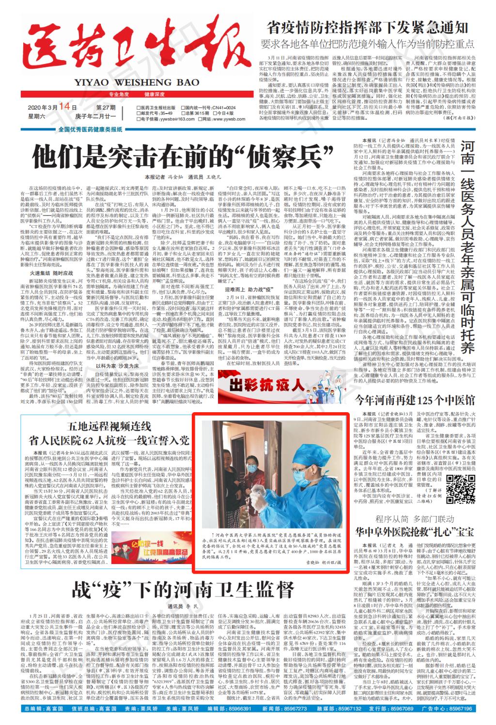 编者按:2020年3月14日,医药卫生报头版对我校三附院41个党支部党员自愿报名成立了由50人组成的“党员志愿服务队”,协助未来路街道办事处、康复社区对外地返郑人员实施社区医学观察服务管理的典型事迹进行报道。此前,学习强国、新华社、河南党刊、河南日报、河南日报客户端等媒体广泛报道了三附院“党员志愿服务队”事迹。现将医药卫生报全文刊发如下: