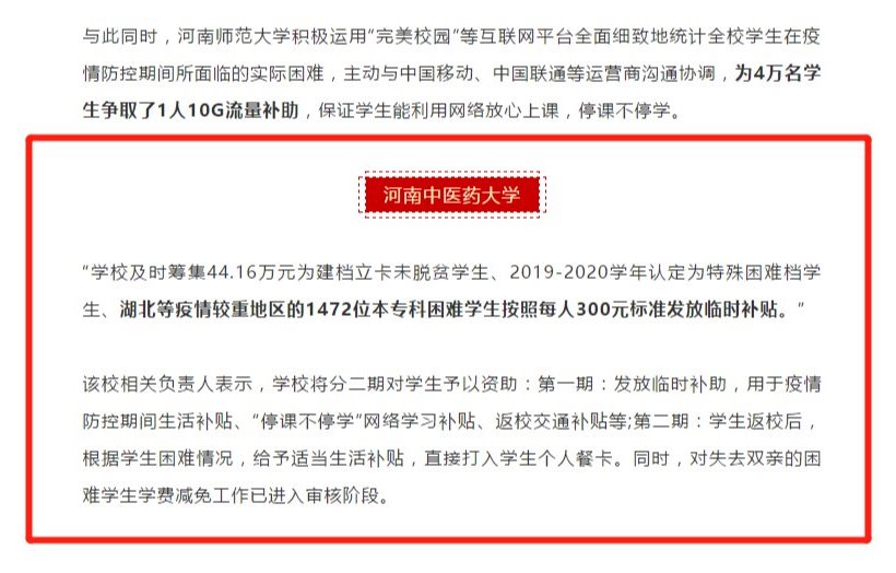 “学校及时筹集44.16万元为建档立卡未脱贫学生、2019-2020学年认定为特殊困难档学生、湖北等疫情较重地区的1472位本专科困难学生按照每人300元标准发放临时补贴。”