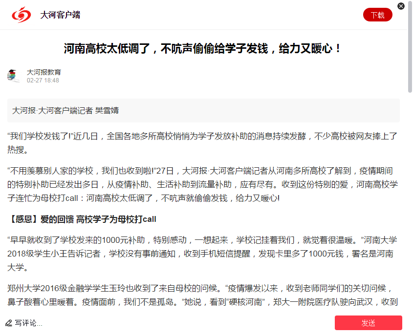 “不用羡慕别人家的学校,我们也收到啦!”27日,大河报·大河客户端记者从河南多所高校了解到,疫情期间的特别补助已经发出多日,从疫情补助、生活补助到流量补助,应有尽有。收到这份特别的爱,河南高校学子连忙为母校打call:河南高校太低调了,不吭声就偷偷发钱,给力又暖心!