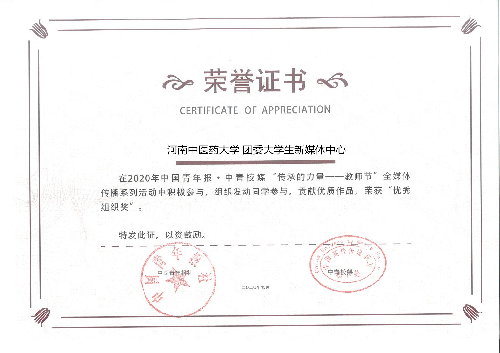 本网讯(文图/郭薇)近日,由教育部主办、中国青年报承办的2020年中国青年报•中青校媒“传承的力量——教师节”全媒体传播系列活动落幕,我校团委大学生新媒体中心荣获“优秀组织奖”。
