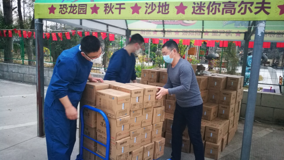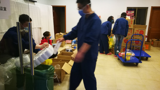 后勤保障组队员按照部署,积极组织队员将急需的生活物资拉回驻地,刘高仁、聂恒等医疗队员们下班后不辞辛苦,给大家分发物品。