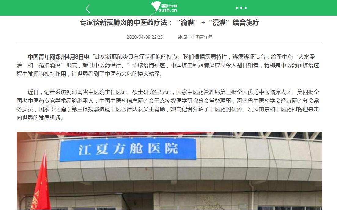 中国青年网郑州4月8日电“此次新冠肺炎具有症状相似的特点。我们根据疾病特性,辨病辨证结合,给予中药‘大水漫灌’和‘精准滴灌’形式,施以中医药治疗。”全球疫情肆虐,中国抗击新冠肺炎成果令人刮目相看,特别是中医药在抗疫过程中发挥的独特作用,让世界看到了中医药文化的博大精深。