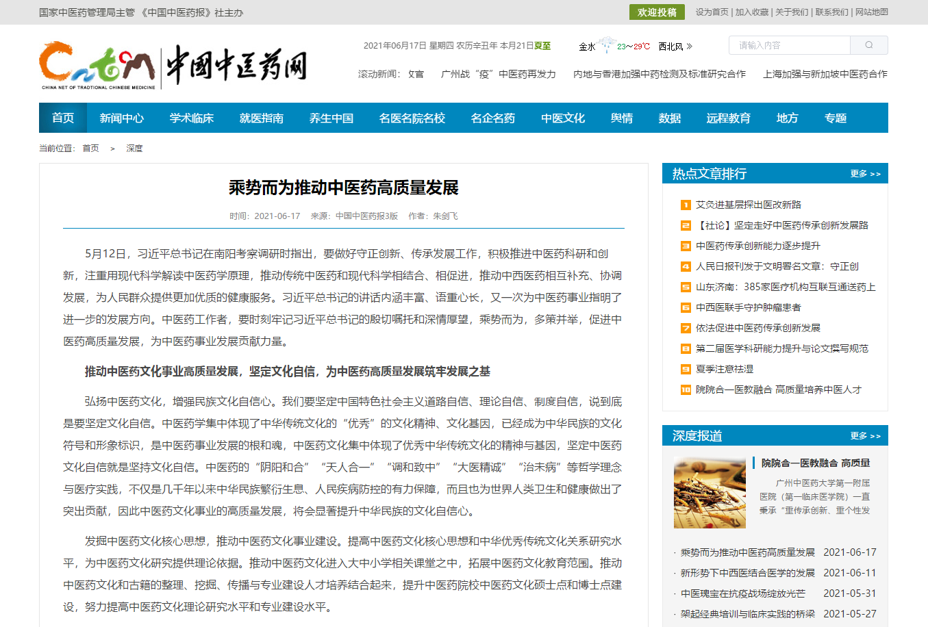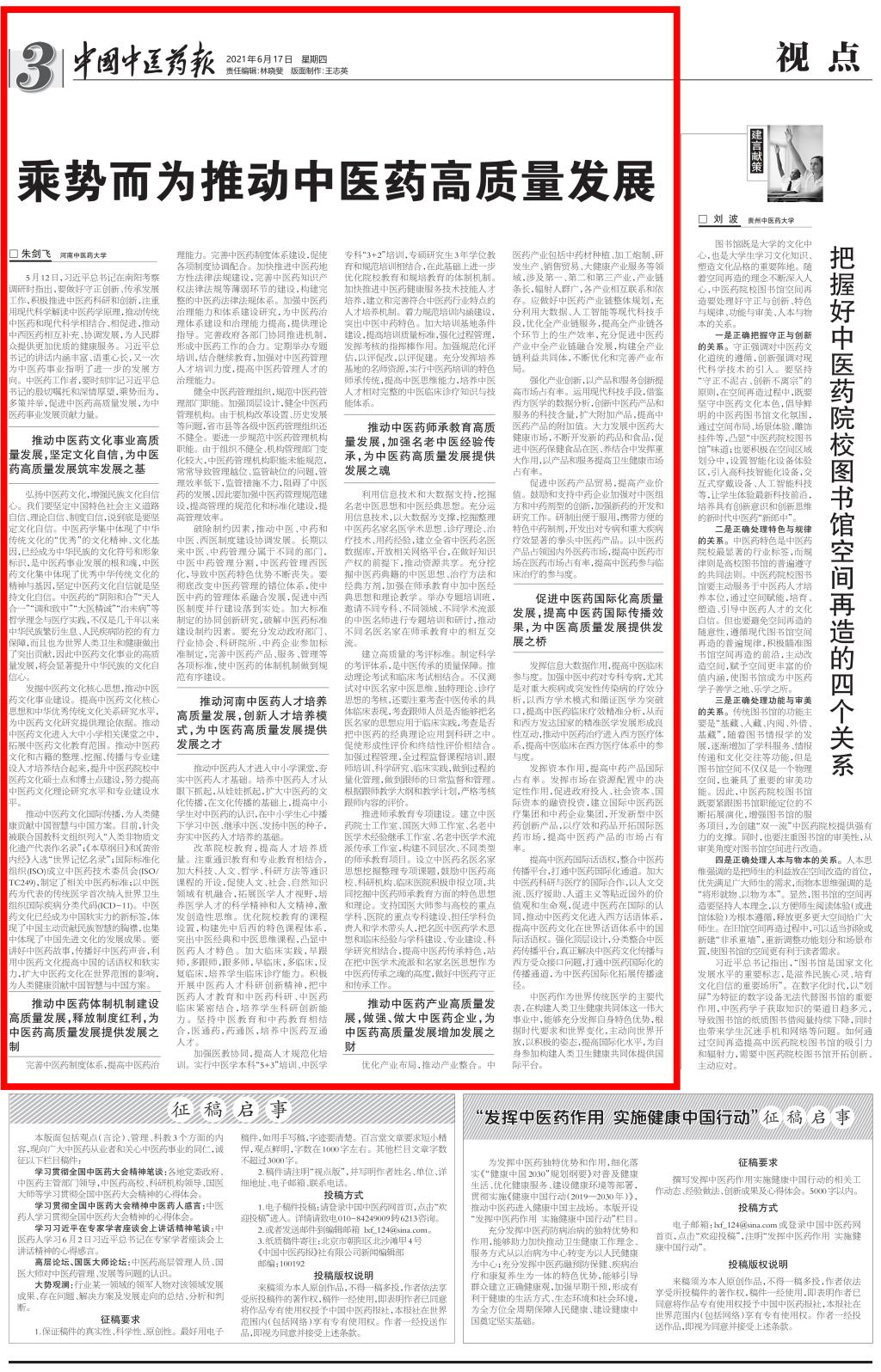 编者按:2021年6月17日,中国中医药报、中国中医药网对我校国际教育学院副院长朱剑飞教授的理论文章《乘势而为推动中医药高质量发展》进行报道。现将全文刊发如下: