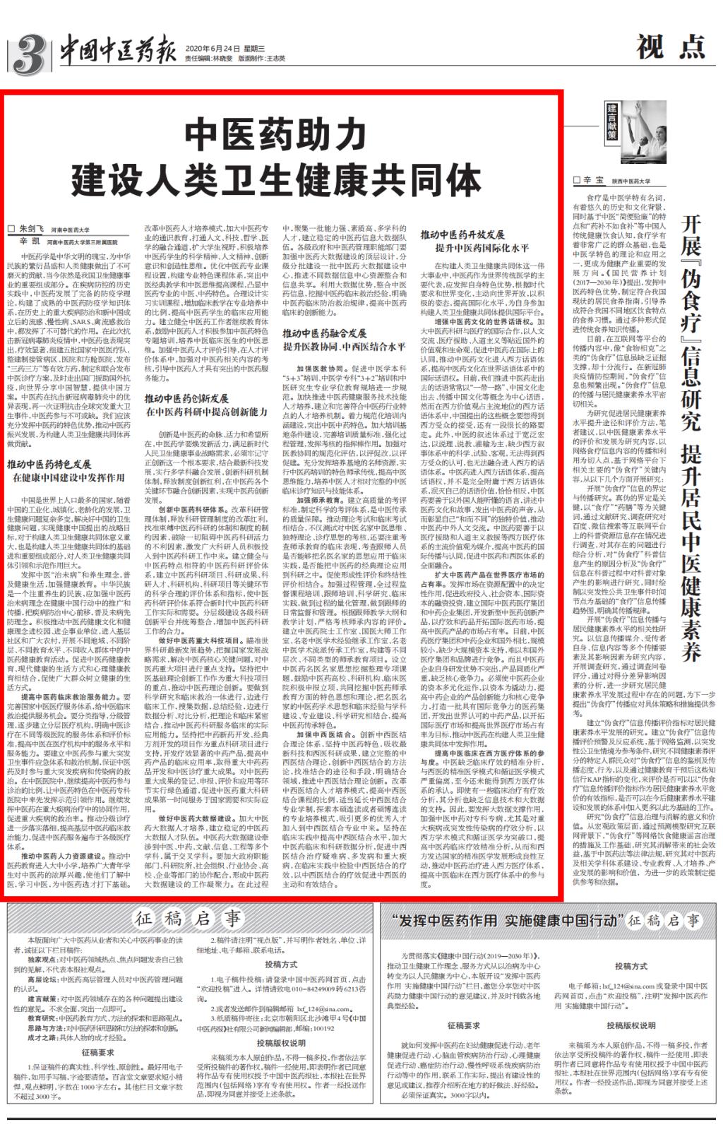编者按:2020年6月24日,中国中医药报对我校教师朱剑飞、辛凯的理论文章《中医药助力建设人类卫生健康共同体》进行报道。现将全文刊发如下: