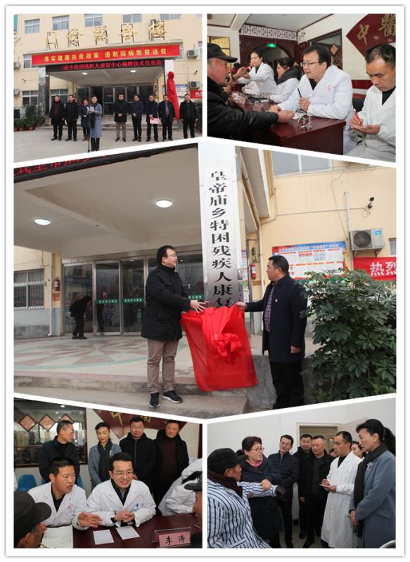 本网讯(文/杨琳 图:李瑞)2019年1月8日,一附院和康复医学院工会积极响应省总工会“劳模助力脱贫攻坚6+1行动”的号召,组队参加了“皇帝庙乡特困残疾人康复中心”揭牌仪式和义诊活动。此项活动由“郑州市医德先进个人”冯晓东、“河南省红会送医活动优秀志愿者”郭健、“河南省五一劳动奖章”获得者李涛共同组成先进模范志愿者服务队,以技术帮扶的实际行动助力脱贫攻坚。这次活动也是省、市工会系统2019年的第一次活动。临颍县卫健委党委书记、主任聂红军主持了揭牌仪式,一附院工会主席张婉红对中心的成立表示祝贺,河南省康复协会会长、校康复学院副院长、一附院康复科主任冯晓东与皇帝庙乡卫生院院长陈世举共同为中心揭牌。