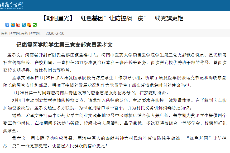 编者按:2020年2月10日,医药卫生网对我校康复医学院学生第三党支部党员孟孝文志愿奔赴防控一线进行报道。现将全文刊发如下: