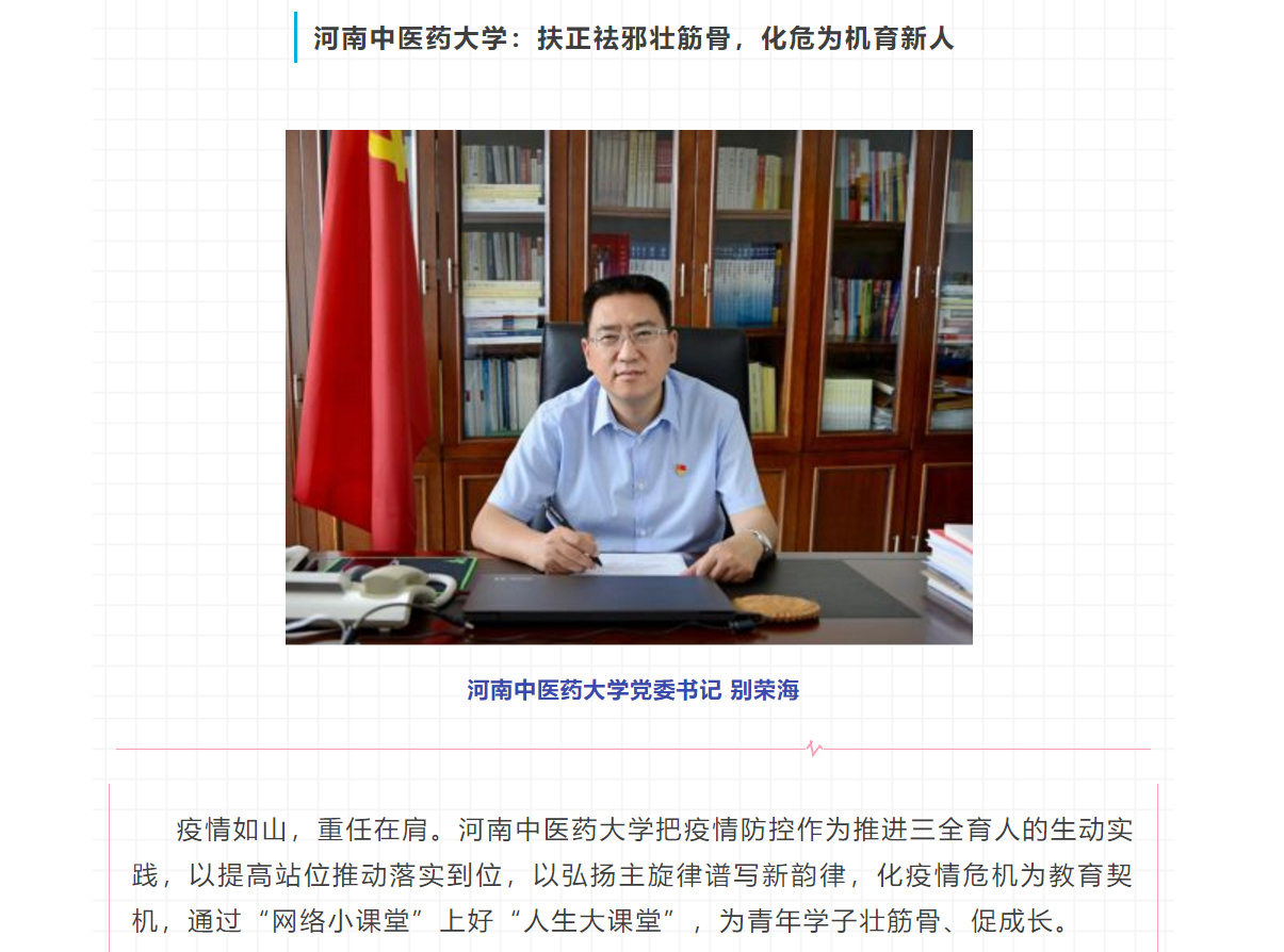 编者按:2020年03月21日,河南省教育厅官微对我校党委书记别荣海疫情大考下为党育人的使命担当进行报道。现将部分文章刊发如下: