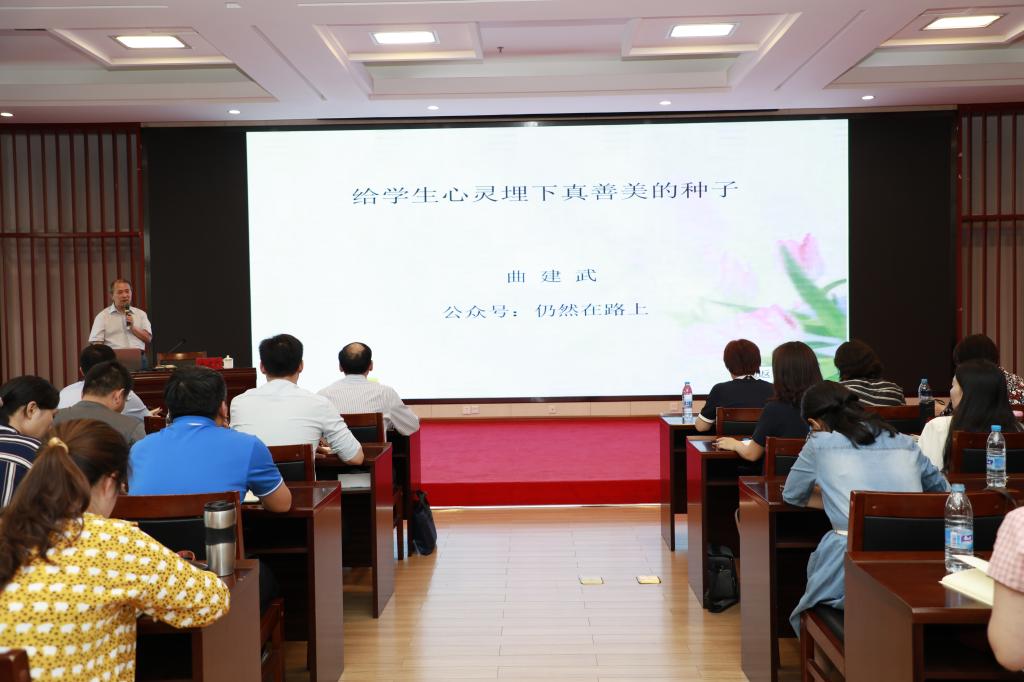 本网讯(文图/岳颀)2019年5月30日下午,我校2019年辅导员系列培训在图书馆第二报告厅举行。全国“时代楷模”“全国优秀教师”“全国师德标兵”“全国辅导员年度人物”获得者、大连海事大学博士生导师曲建武教授以《给学生心灵埋下真善美的种子》为题,为我校全体辅导员作报告。学工部、研工部、校团委相关人员及全体辅导员参加,培训会由校党委委员、工会主席张加民主持。