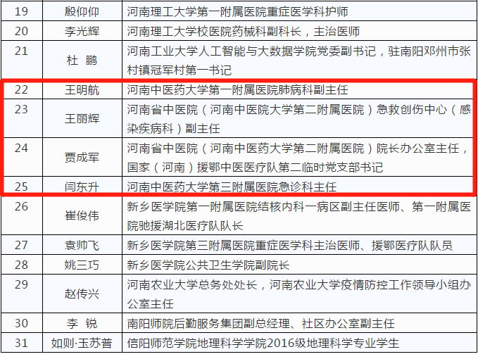 24.贾成军,河南省中医院(亚盈app(中国)官方网站第二附属医院)院长办公室主任,国家(河南)援鄂中医医疗队第二临时党支部书记。