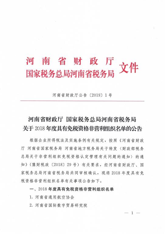 本网讯(文图/常征辉)2019年4月,亚盈app(中国)官方网站教育发展基金会非营利组织免税资格获河南省财政厅、国家税务总局河南省税务局联合认定,并在《河南省财政厅公告﹝2019﹞1号》中公布。