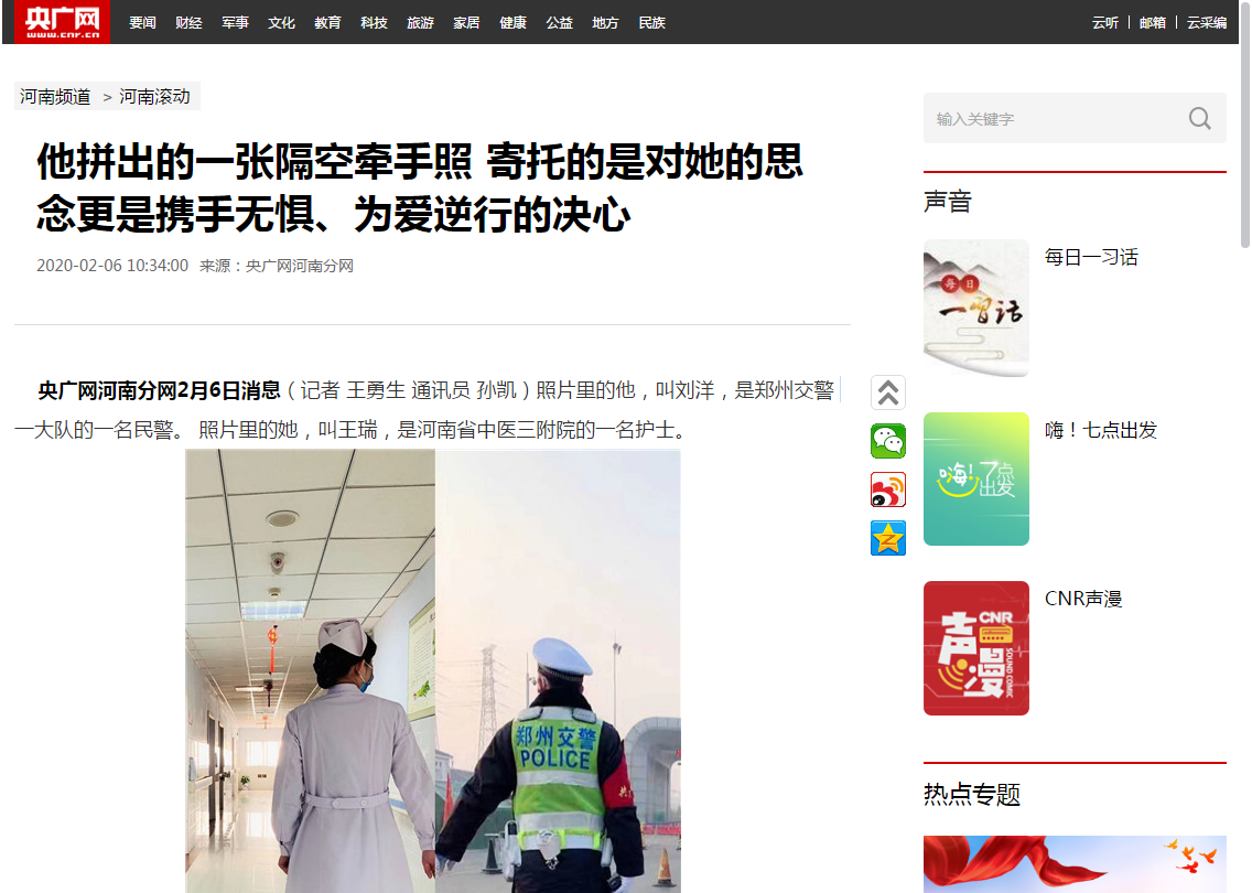 编者按:2020年2月6日,央广网对我校三附院护士王瑞夫妇二人双双奔赴抗击疫情第一线进行报道。现将全文刊发如下: