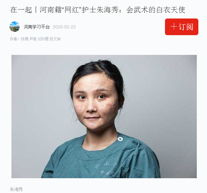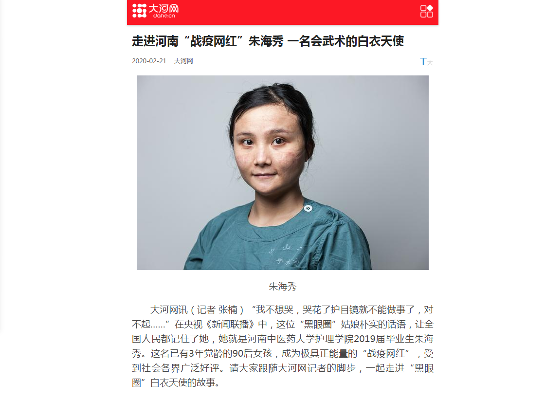 编者按:2020年2月21日-22日,学习强国、大河网分别以《在一起丨河南籍“网红”护士朱海秀:会武术的白衣天使》《走进河南“战疫网红”朱海秀 一名会武术的白衣天使》为题,对我校2019届毕业生朱海秀的故事进行报道。