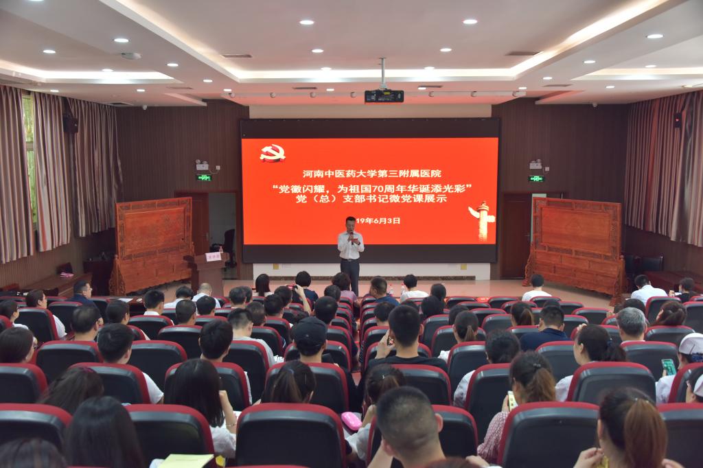 本网讯(文/胡兴旺 图/田辉)2019年6月3日下午,一场别开生面的微党课在三附院学术交流中心拉开帷幕。本次微党课是我院“党徽闪耀、为新中国70周年华诞添光彩”系列活动之一,全院党(总)支部书记、委员和党员代表百余名参加了活动,院党委副书记陶洁,党委委员、工会主席郭书敏出席。