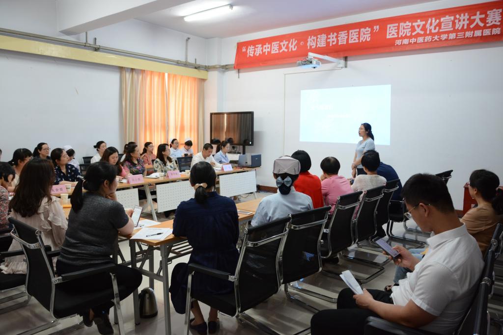 本网讯(文/吴金苗 图/潘向昆)为进一步推动医院文化建设,塑造医院形象,培育科室文化内涵,2019年5月21日,由三附院工会主办的“传承中医文化•构建书香医院”医院文化宣讲大赛在综合楼1109会议室举行。来自临床、职能科室的20位选手参加了比赛。