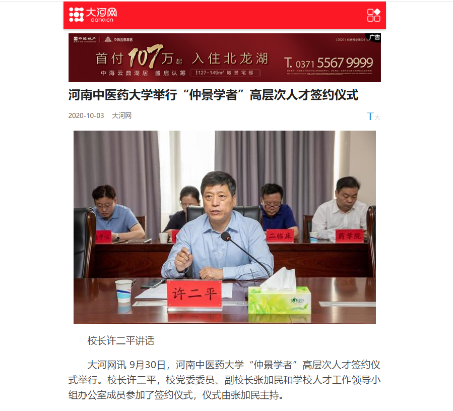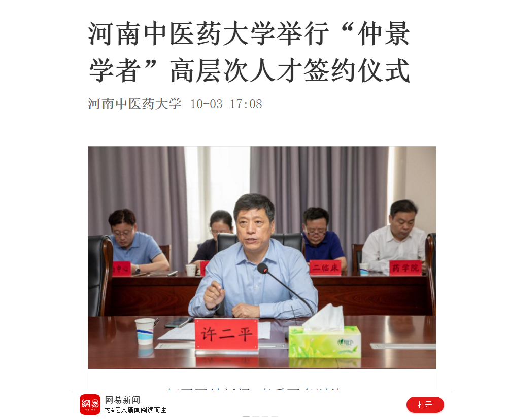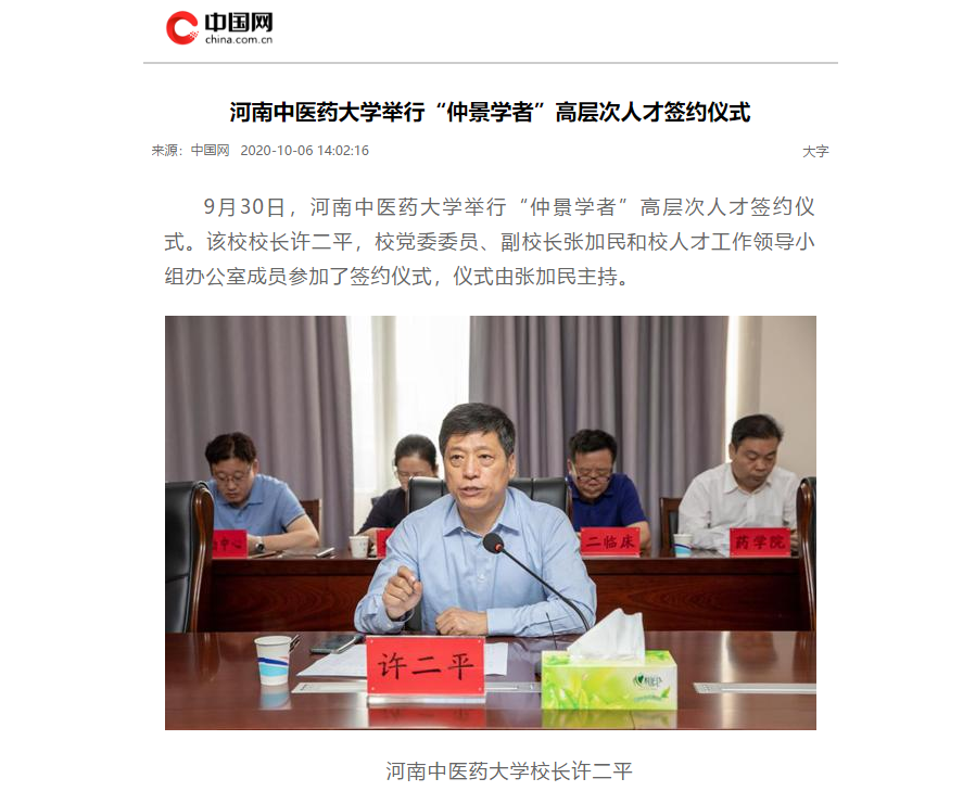 2020年10月3日-6日,中国网、大河网、网易新闻对我校举行“仲景学者”高层次人才签约仪式进行报道。