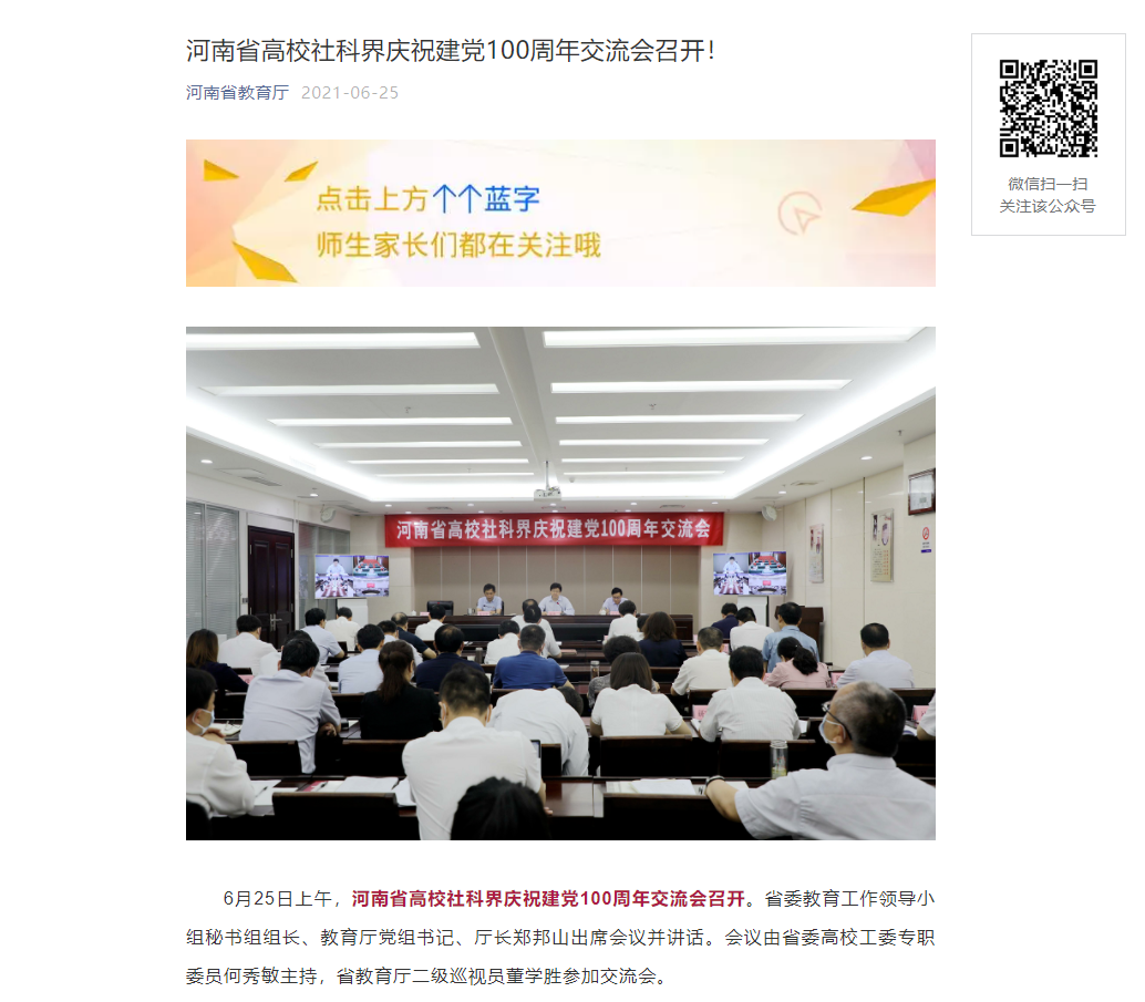 6月25日上午,河南省高校社科界庆祝建党100周年交流会召开。省委教育工作领导小组秘书组组长、教育厅党组书记、厅长郑邦山出席会议并讲话。会议由省委高校工委专职委员何秀敏主持,省教育厅二级巡视员董学胜参加交流会。