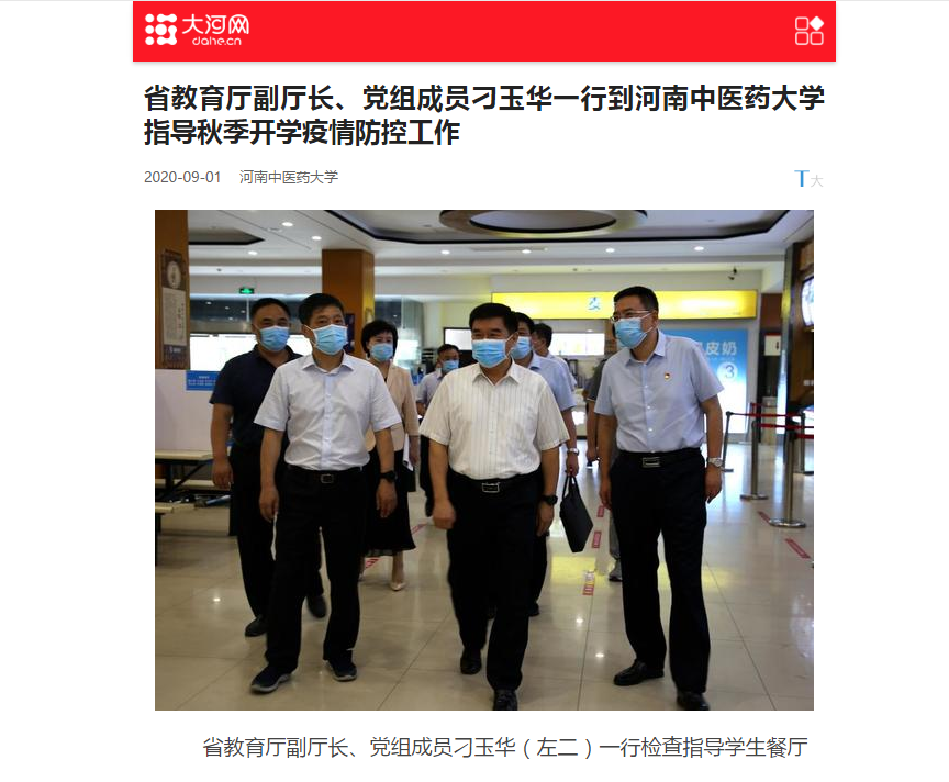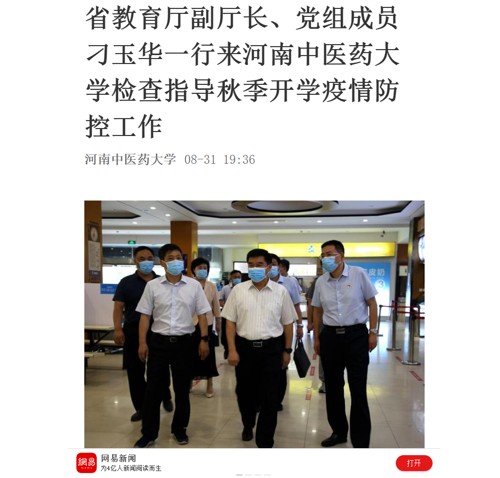 2020年8月31日-9月1日,大河网、网易新闻对省教育厅副厅长、党组成员刁玉华一行来我校检查指导秋季开学疫情防控工作进行报道。