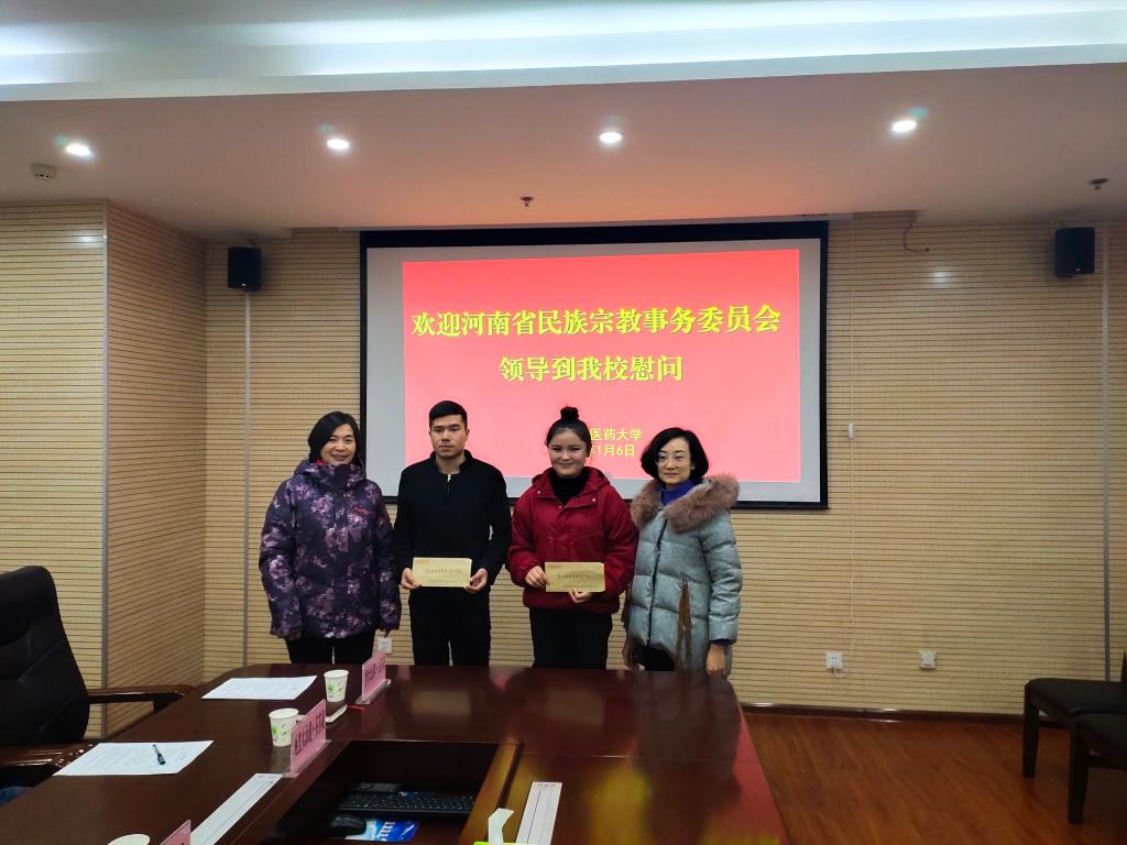 本网讯(文图/努尔比耶·玉苏普)2020年1月6日下午,河南省民族宗教事务委员会涉疆办二级调研员薛鹭、四级调研员赵洋一行莅临我校,慰问新疆籍少数民族贫困学生。