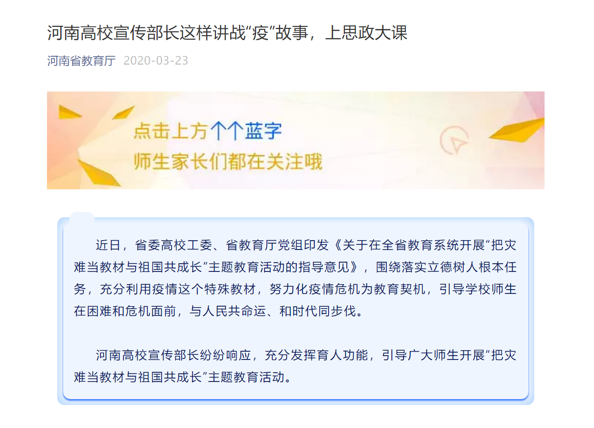 编者按:2020年03月23日,河南省教育厅官微对我校党委委员、宣传部部长刘保庆讲战“疫”故事、上思政大课进行报道。现将部分文章刊发如下: