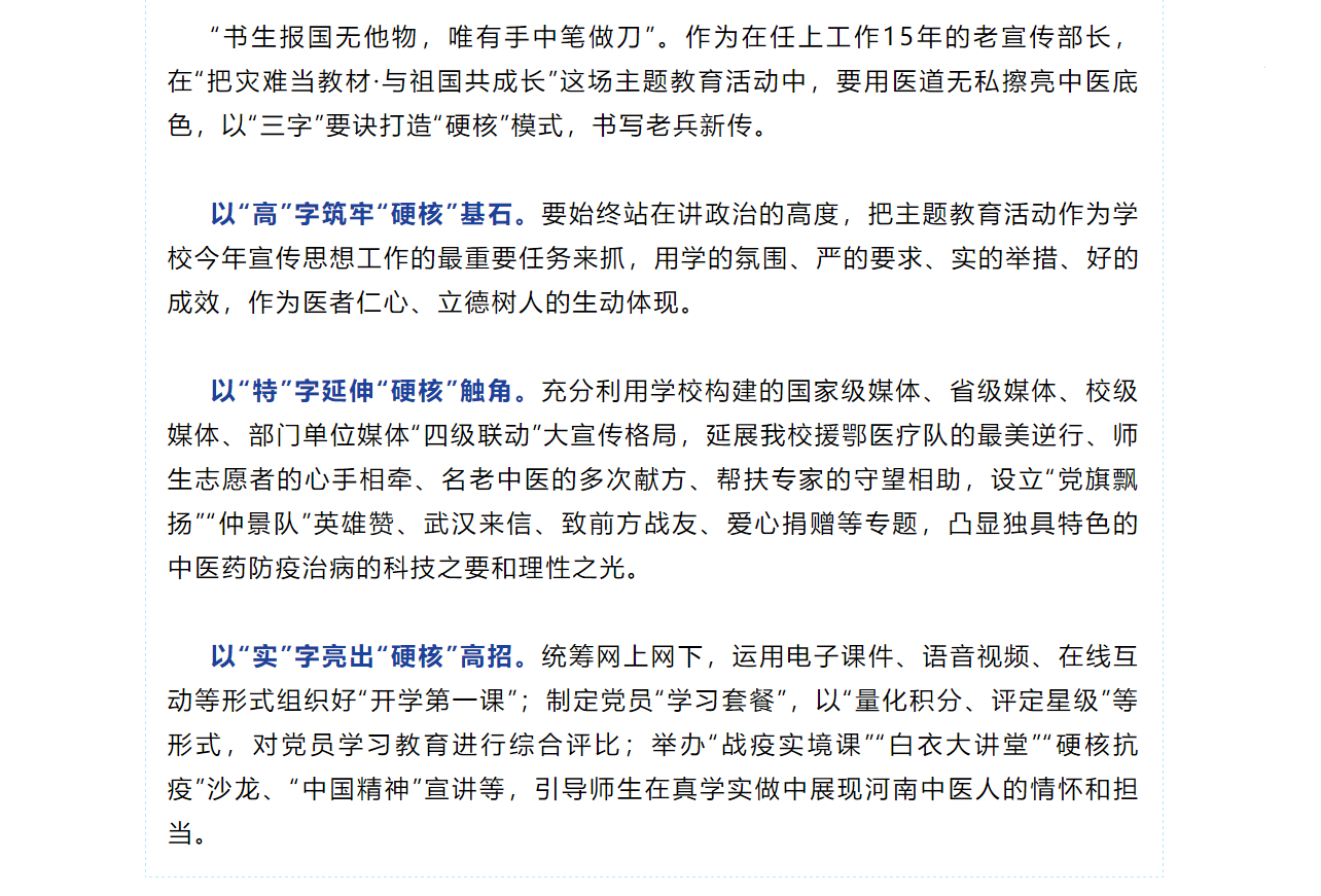 以“实”字亮出“硬核”高招。统筹网上网下,运用电子课件、语音视频、在线互动等形式组织好“开学第一课”;制定党员“学习套餐”,以“量化积分、评定星级”等形式,对党员学习教育进行综合评比;举办“战疫实境课”“白衣大讲堂”“硬核抗疫”沙龙、“中国精神”宣讲等,引导师生在真学实做中展现河南中医人的情怀和担当。