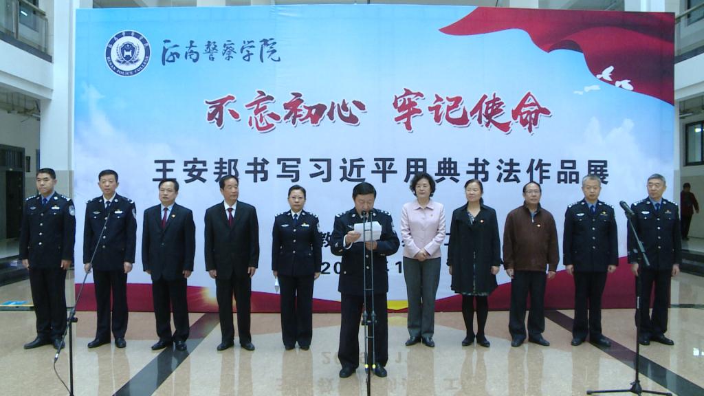 本网讯(文/李冕 图/崔金鑫)2019年11月4日上午,我校王安邦教授“不忘初心、牢记使命”书写习近平用典书法作品展在河南警察学院成功拉开帷幕。河南警察学院党委副书记尚俊志同志出席并致辞,我校党委副书记张丽霞、校工会副主席曹蕴莉、王安邦教授及离退休工作处相关负责人应邀出席开幕式。警察学院师生代表百余人参加开幕式。开幕式由警察学院党委副书记徐晓慧主持。