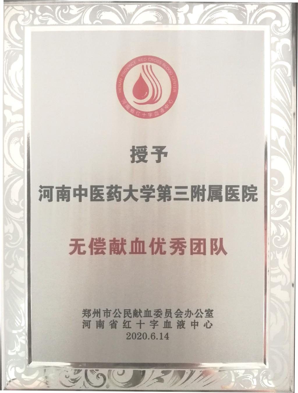 本网讯(文/图 任聪颖)2020年6月14日是第十七个“世界献血者日”,为弘扬正气、表彰先进,鼓励全社会关心、支持和参与无偿献血工作,郑州市公民献血委员会、河南省红十字血液中心发布《关于表彰郑州市无偿献血优秀团队和先进个人的通报》,并在郑东新区CBD文化广场举行授牌及颁奖仪式。我校三附院被授予“无偿献血优秀团队”称号,三附院任聪颖同志荣获“无偿献血活动优秀组织者”称号。