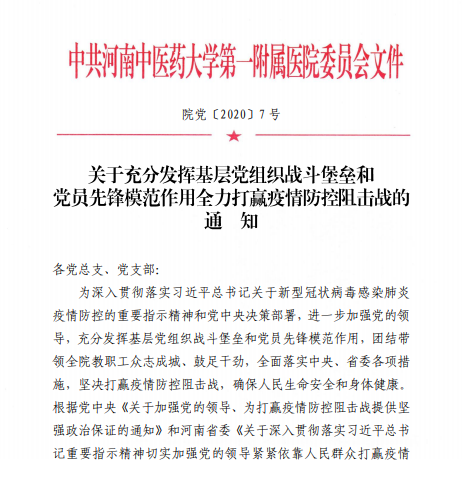为深入贯彻落实习近平总书记重要指示精神和党中央决策部署,进一步加强党的领导,充分发挥基层党组织战斗堡垒和党员先锋模范作用,1月26日,医院党委印发了《关于充分发挥基层党组织战斗堡垒和党员先锋模范作用,全力打赢疫情防控阻击战的通知》。从“强化政治担当、强化组织引领、强化示范带动”三个方面号召全院各级党组织和党员职工,在医院党委的坚强领导下,甘于担当尽责、勇做先锋模范,持续做好疫情防控各项任务,坚决打赢疫情防控阻击战,确保人民生命安全和身体健康。