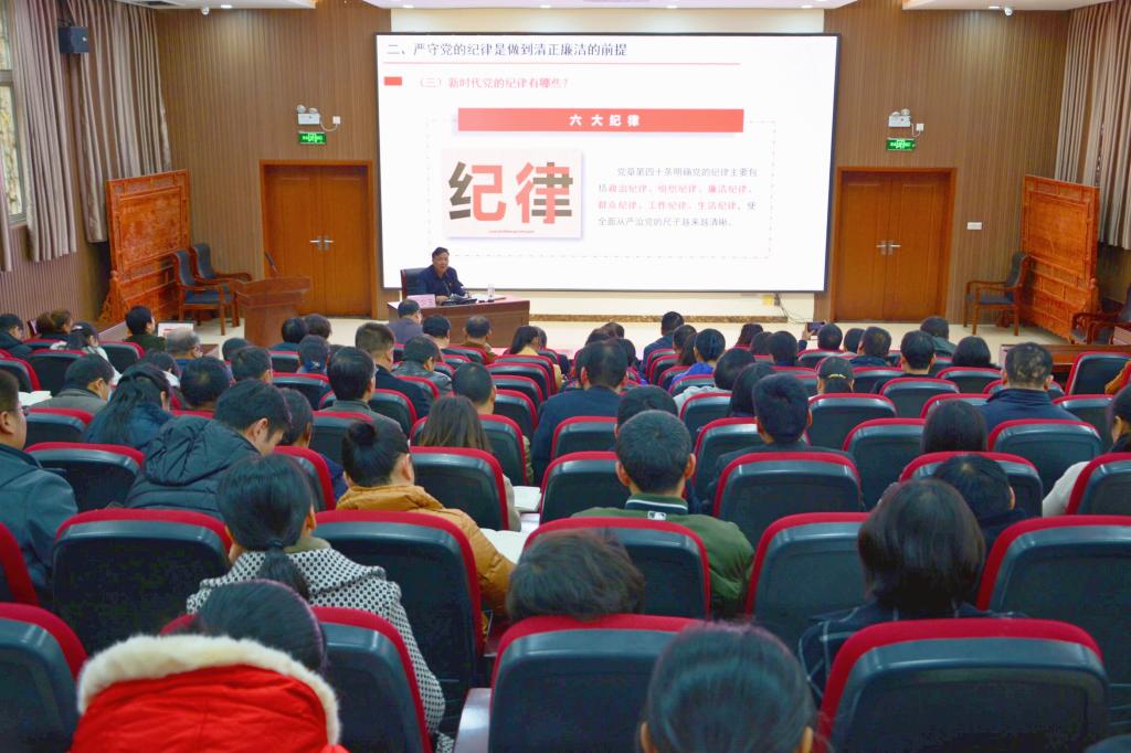 本网讯(文/李博彧 图/潘向昆)为深入推动“不忘初心、牢记使命”主题教育入脑入心,进一步强化纪律作风修养,增强廉洁自律意识,实现主题教育清正廉洁作表率的具体目标,2019年11月26日下午,校纪委书记王少玉以“严守党的纪律,作清正廉洁表率”为题,给三附院全体院领导、中层干部、纪委委员、纪检委员带来了一场精彩生动的廉洁教育专题党课。党课由医院党委副书记陶洁主持。
