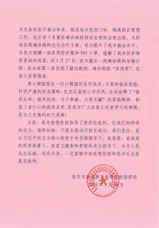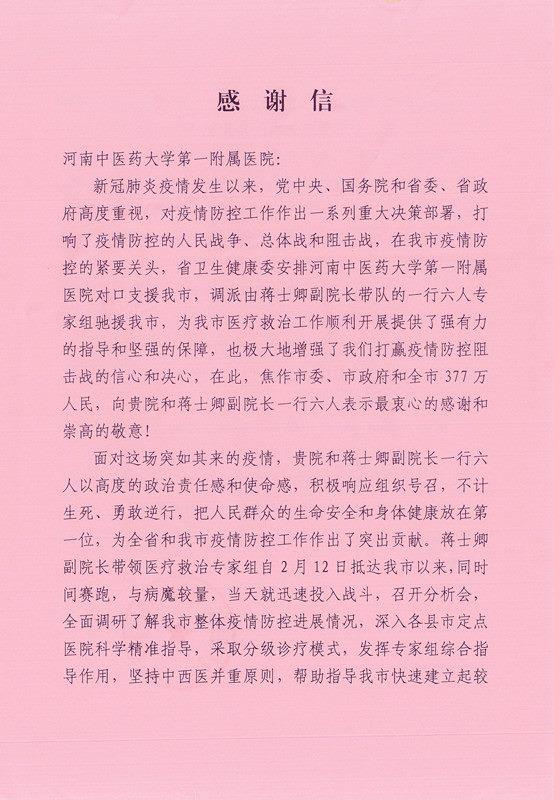 编者按:2020年1月,新冠肺炎疫情肆虐神州大地,受河南省疫情防控指挥部的委派,我校一附院组建副院长蒋士卿等专家组成专家组前往焦作,开展新冠肺炎医疗救治对口支援工作。专家组不畏艰险、与时间赛跑,到达焦作后的第一时间便投入到了疫情防控工作。在焦作市新冠肺炎定点收治医院——焦作市第三人民医院,专家组坚持每天对所有在院患者病情进行会诊、评估,指导患者的治疗、护理和医院感控工作。同时,专家组还深入各县市定点医院进行指导,对疫情防控工作提出合理化意见和建议。日前,焦作市新冠肺炎疫情防控指挥部发来感谢信,对专家组及一附院表示感谢,现将感谢信刊发如下。