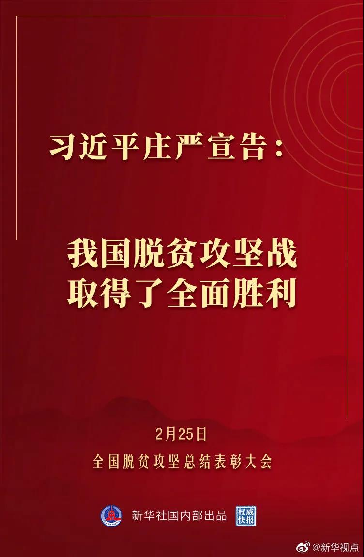 习近平在全国脱贫攻坚总结表彰大会上发表重要讲话,庄严宣告,经过全党全国各族人民共同努力,在迎来中国共产党成立一百周年的重要时刻,我国脱贫攻坚战取得了全面胜利,现行标准下9899万农村贫困人口全部脱贫,832个贫困县全部摘帽,12.8万个贫困村全部出列,区域性整体贫困得到解决,完成了消除绝对贫困的艰巨任务,创造了又一个彪炳史册的人间奇迹!这是中国人民的伟大光荣,是中国共产党的伟大光荣,是中华民族的伟大光荣!