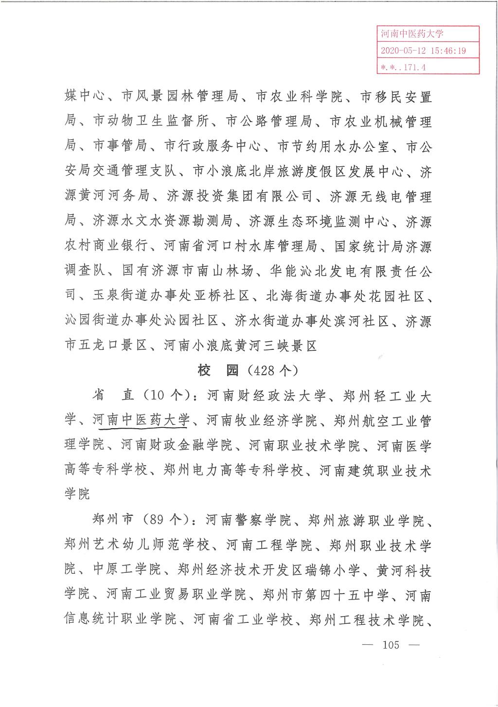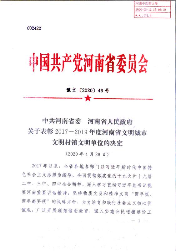 本网讯(文/图 蔡源源)近日,中共河南省委、河南省人民政府印发《关于表彰2017-2019年度河南省文明城市文明村镇文明单位的决定》(豫文〔2020〕43号),我校被授予“河南省文明校园”荣誉称号。此次河南省文明校园评选是全省精神文明创建工作改革后开展的第一次评选,是我校继2013年成功创建省级文明单位后精神文明创建取得的又一重大标志性成果,为学校精神文明建设迈向更高台阶奠定了坚实基础。