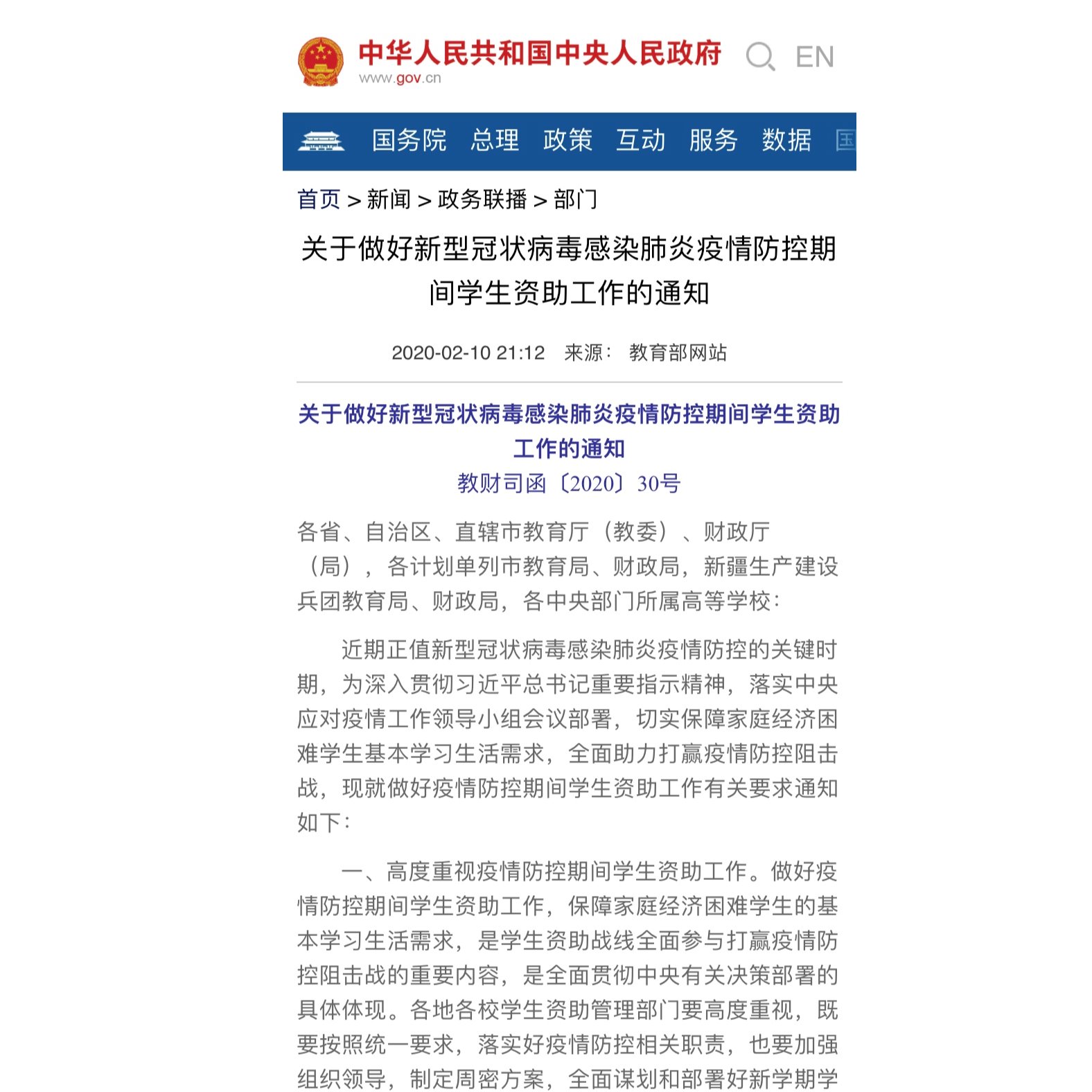 教育部、财政部联合印发《关于做好新型冠状病毒感染肺炎疫情防控期间学生资助工作的通知》