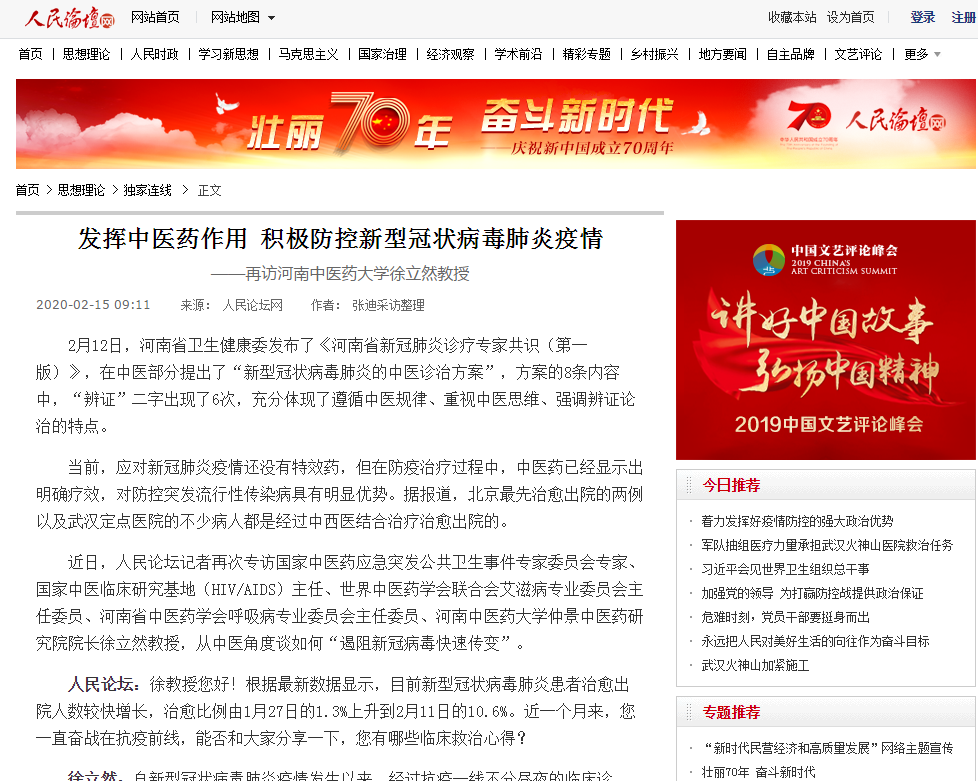 编者按:2020年2月11日、15日,人民论坛网分别以“从中医药视角谈新型冠状病毒肺炎的防治”“发挥中医药作用 积极防控新型冠状病毒肺炎疫情”为题,专访我校一附院徐立然教授,现将专访全文刊发如下: