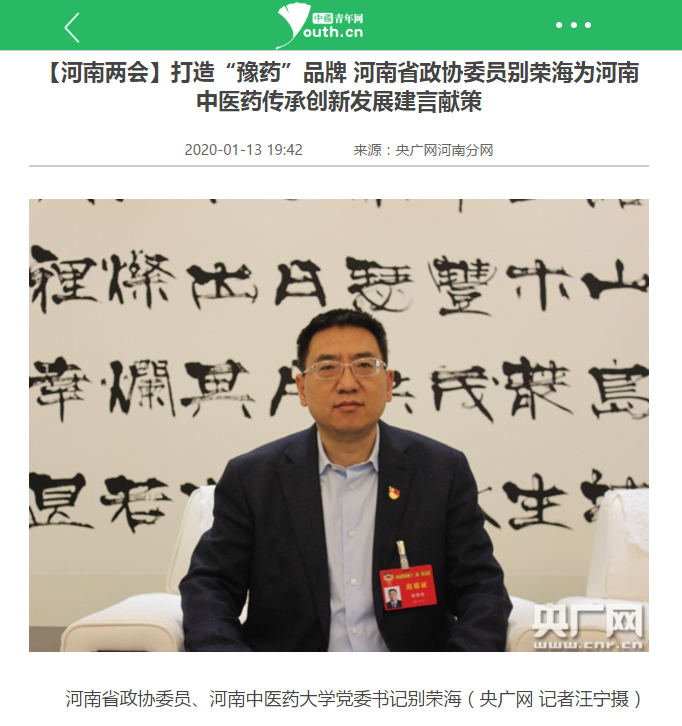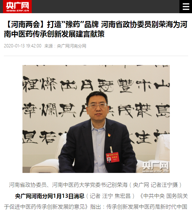 编者按:2020年1月13日,央广网、中青网等媒体对河南省政协委员、校党委书记别荣海为河南中医药传承创新发展建言献策进行报道。现将全文刊发如下: