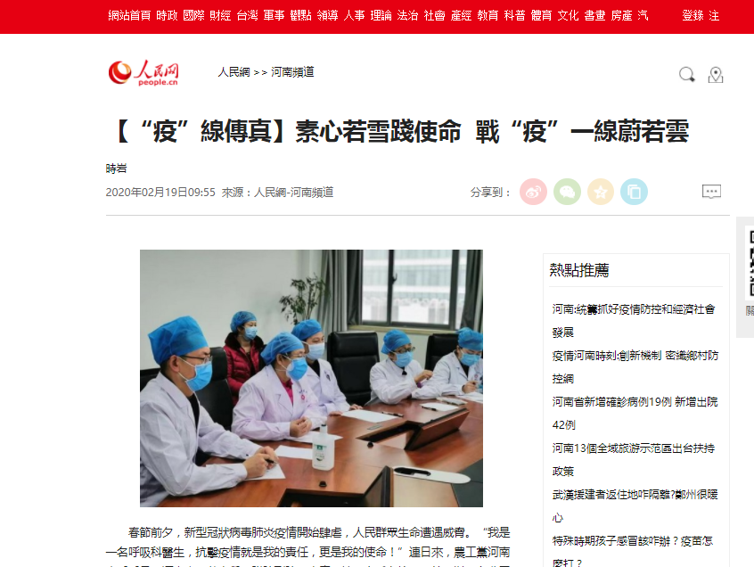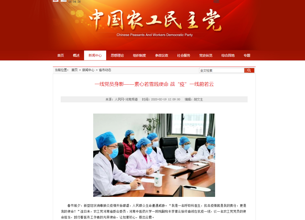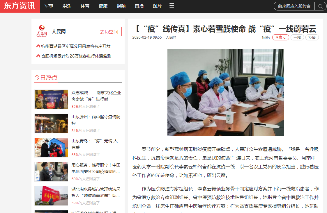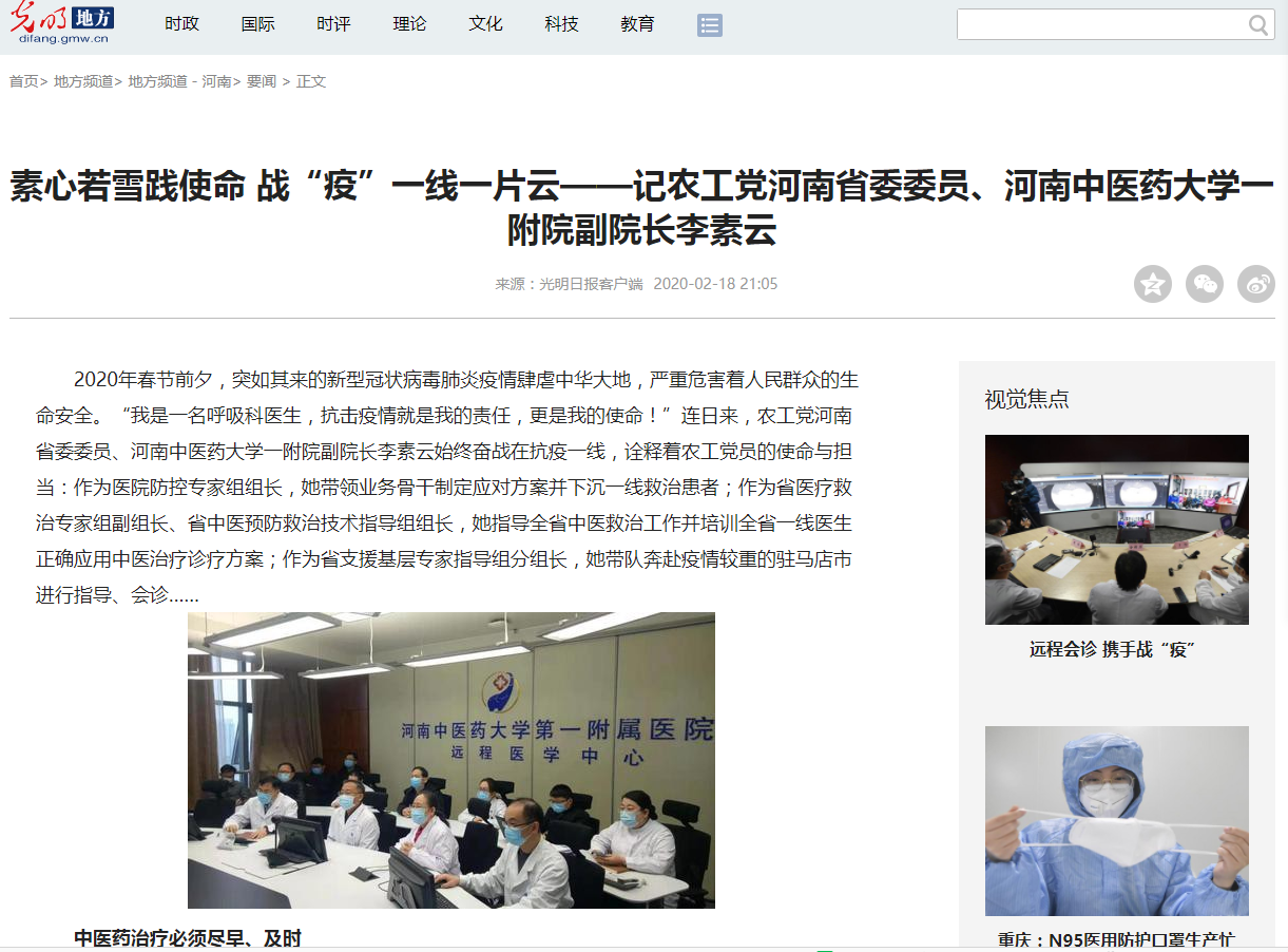 编者按:2020年2月19日,人民网、光明网、中国农工民主党门户网站、东方资讯、人民看点新媒体等媒体对我校一附院副院长李素云始终奋战在抗疫一线进行报道。现将光明网全文刊发如下: