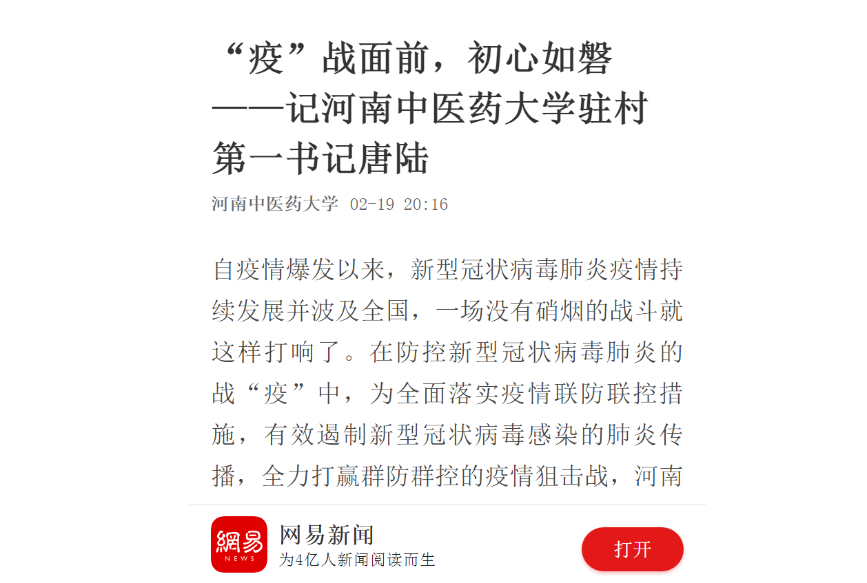 编者按:2020年2月19日,网易新闻对我校驻村第一书记唐陆坚守疫情防控第一线进行报道。现将全文刊发如下: