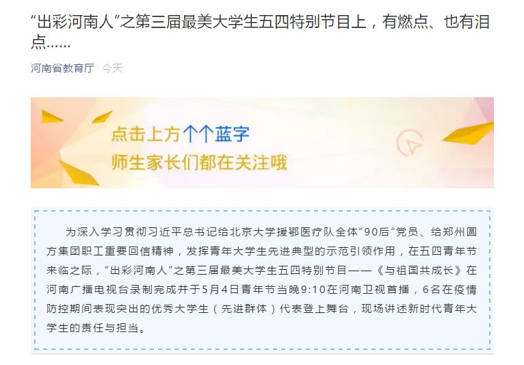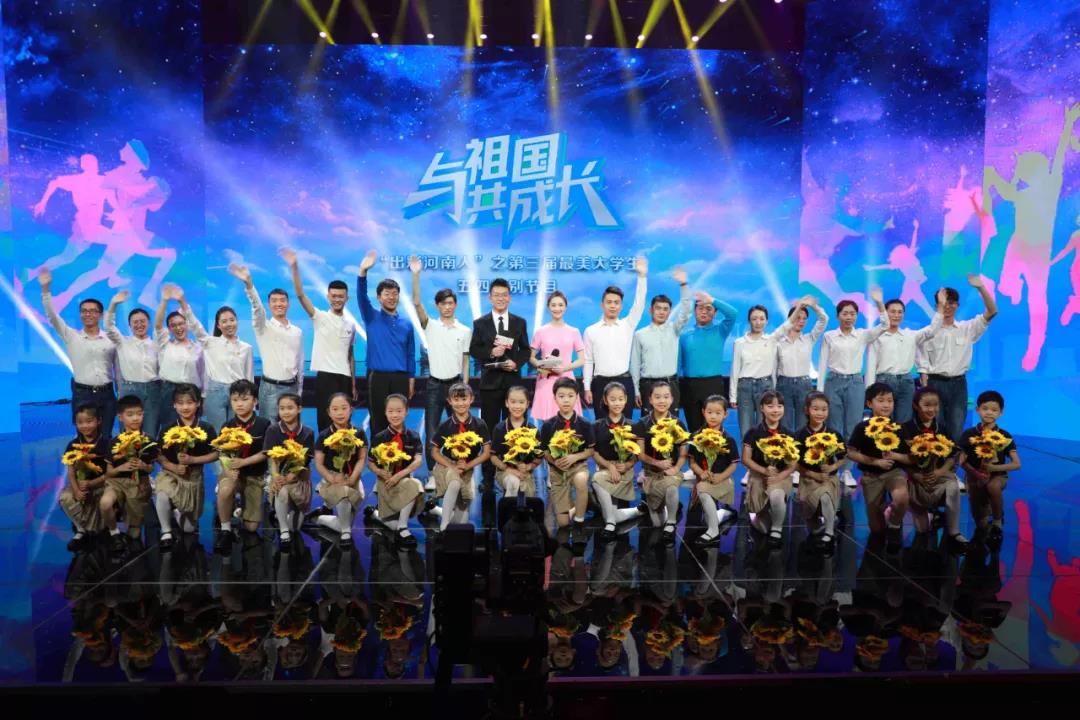 为深入学习贯彻习近平总书记给北京大学援鄂医疗队全体“90后”党员、给郑州圆方集团职工重要回信精神,发挥青年大学生先进典型的示范引领作用,在五四青年节来临之际,“出彩河南人”之第三届最美大学生五四特别节目——《与祖国共成长》在河南广播电视台录制完成并于5月4日青年节当晚9:10在河南卫视首播,6名在疫情防控期间表现突出的优秀大学生(先进群体)代表登上舞台,现场讲述新时代青年大学生的责任与担当。