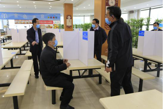 随后,许二平一行又来到学生食堂,实地了解疫情防控期间饮食保障方案和准备情况,认真察看人员进出、体温检测、取餐用餐等流程的具体防控举措,并现场测试了新安装的感应水龙头和手部喷雾消毒装置。在察看食堂内部防控措施时,许二平对餐桌十字隔板的做法十分赞赏,表示这个“小创意”解决了师生单向就餐的“大问题”。